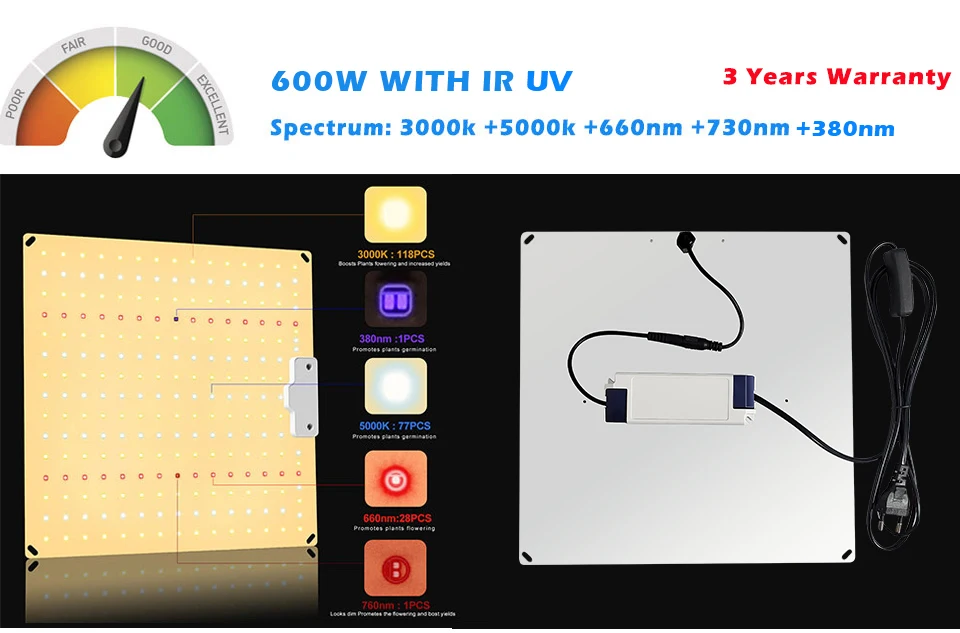 Спектр: 3000K + 5000K + 660NM + 730NM3000K: теплый белый5000K: холодный белый660нм: темно-красный730 нм: инфракрасный380нм: УФФактическая мощность: 115-120 ВтРазмер: 400x300x20ммКомплект с алюминиевым диммируемым Драйвером