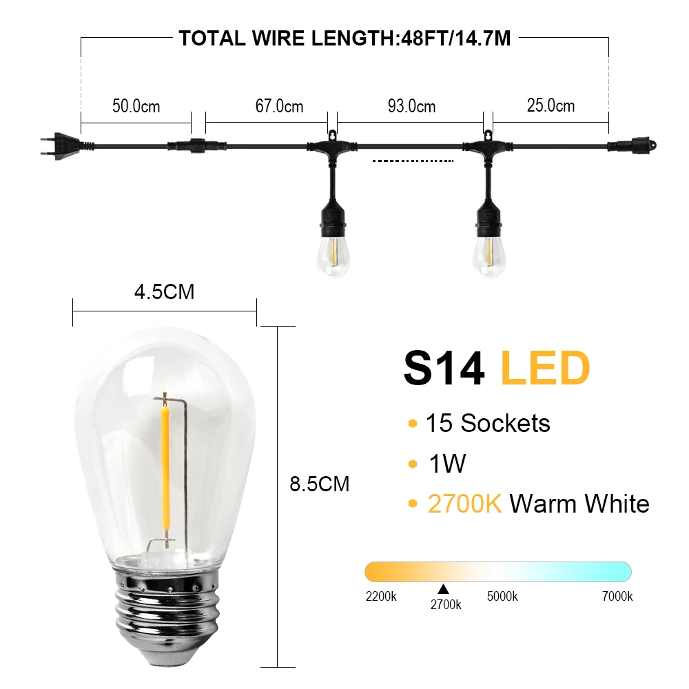 Светодиодная лампа накаливания Эдисона S14, уличная LED гирлянда с 15 лампочками, IP65, 48 футов, 15 м, 1 Вт, для сада, внутреннего дворика, праздника, свадьбы