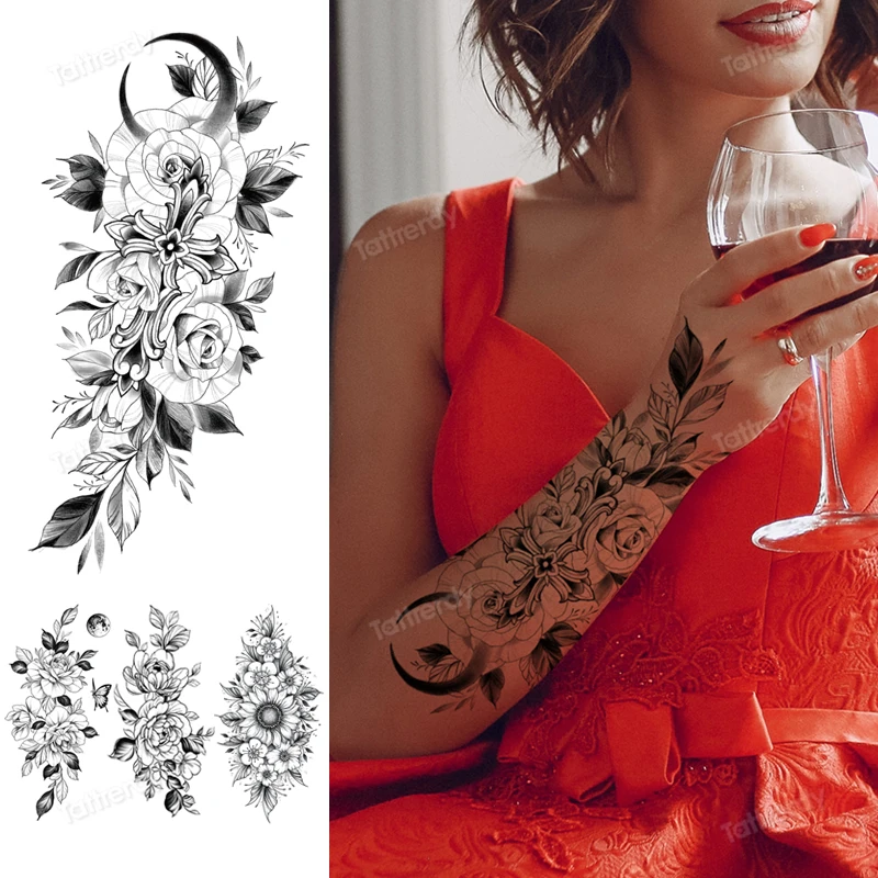 Тату цветок рукав Временные татуировки для женщин; Пикантные женские туфли-фон для фотосъемки стикер татуировки Пион Роза подсолнечника змея татуировка на запястье