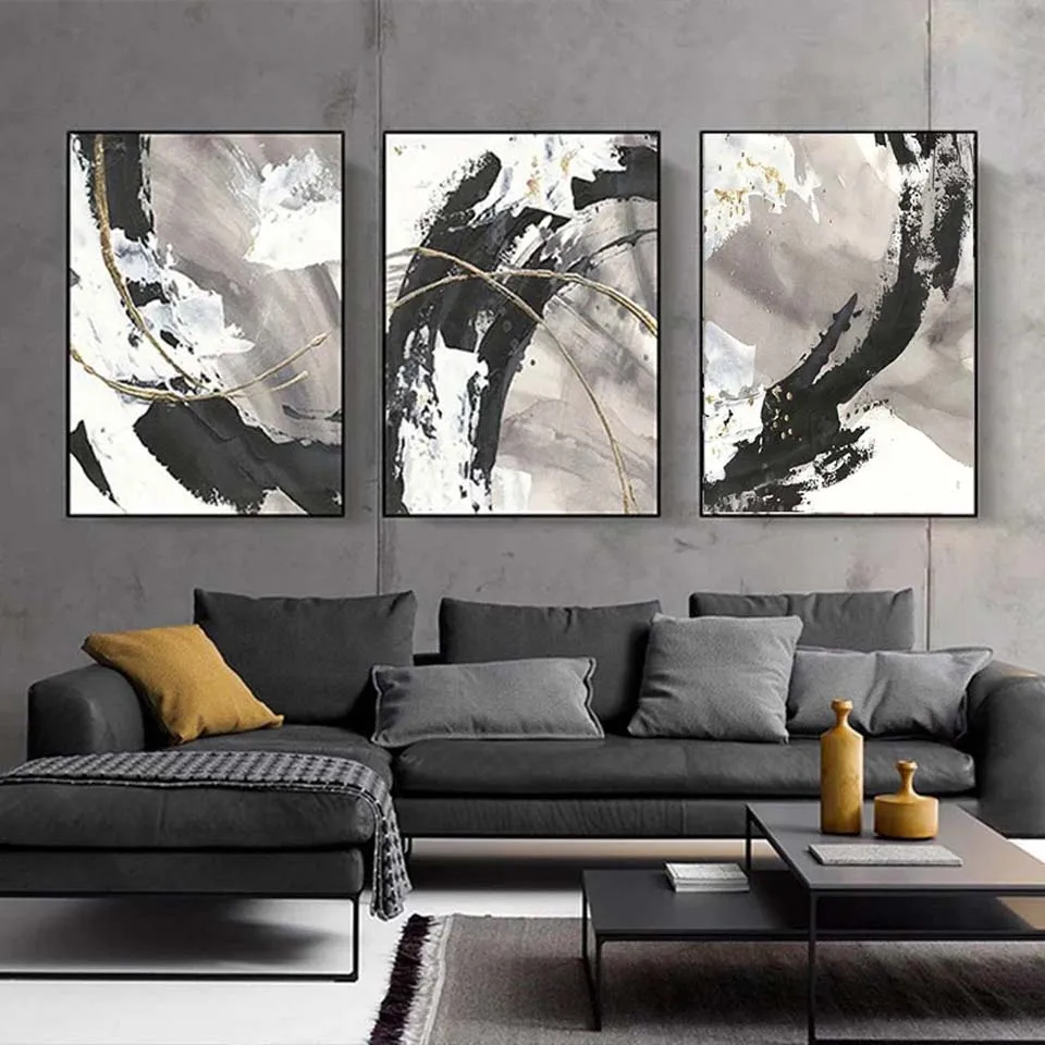 Триптих, Черное золото, листья растений, домашний декор, абстрактна...