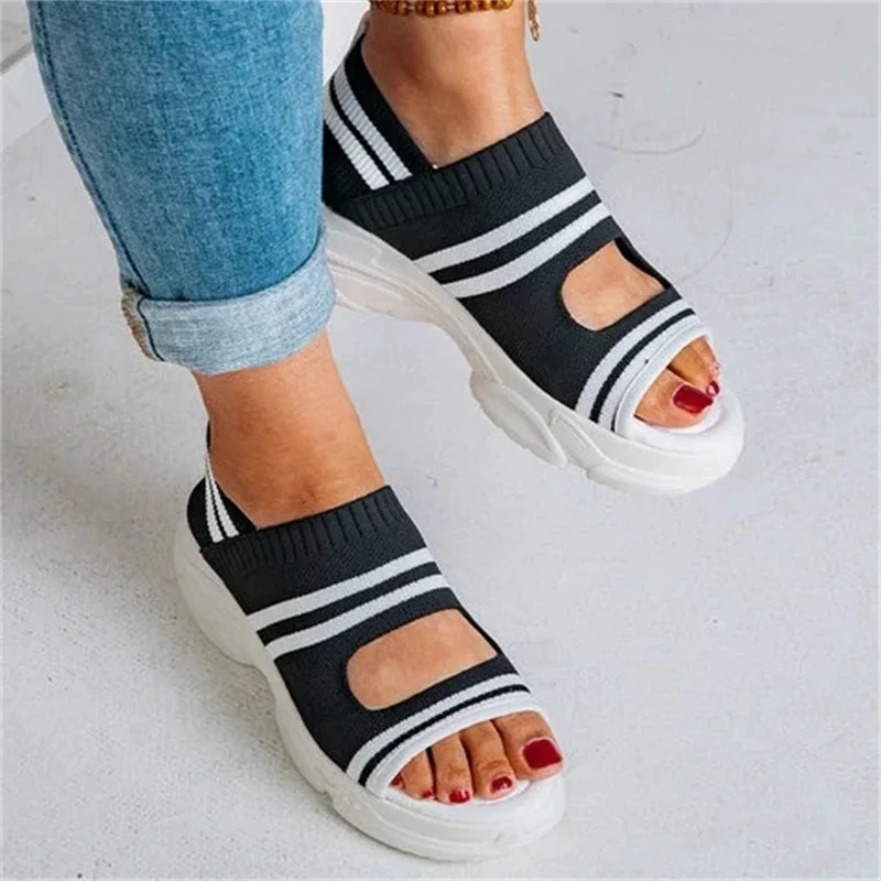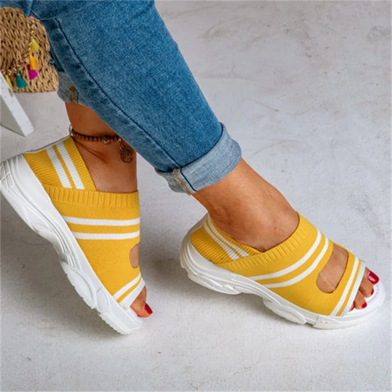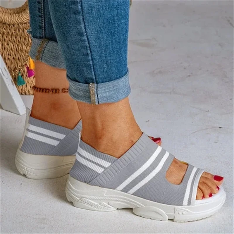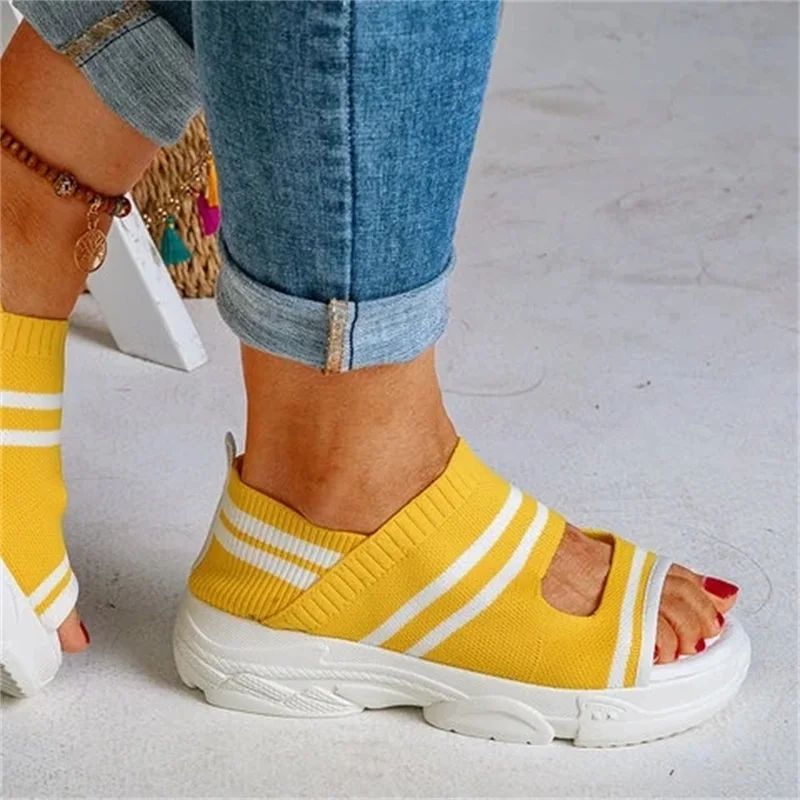 Сандалии женские на платформе, повседневная обувь с открытым носком, в полоску, на танкетке, без застежки, большие размеры, лето