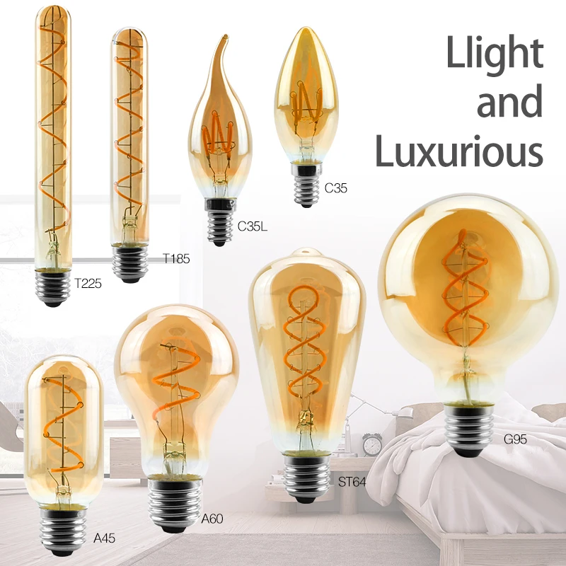 Model 1A60 T45 ST64 G80 G95 G125 T185 T225 (E27 Base) Spiral LED Filament Bu