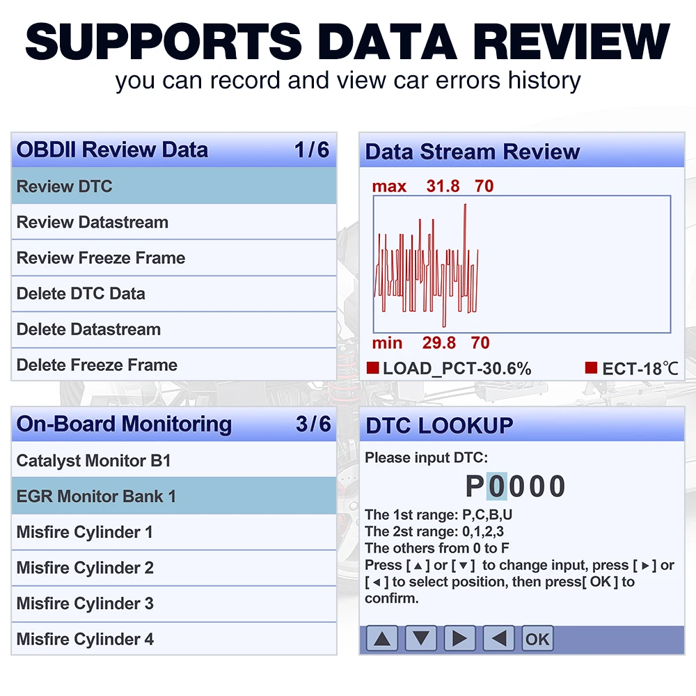 1. Считывание кодов ошибок двигателя или эмиссии.2. Удалите и удалите код неисправности,3. Выключает контрольный свет двигателя (MIL), предупреждающий свет, очищает коды и сбрасывает мониторы4. Извлекает общие (P0, P2, P3 и U0), конкретные от производителя (P1, P3 и U1) коды и коды в ожидания5. Легко определяет причину проверки света двигателя (MIL), показывает определения кодов неисправностей.6. Отображает монитор и I/M состояние готовности (излучения)7. Читает живой поток данных PCM8. Отображает данные датчика в режиме реального времени как в текстовом, так и в режиме графика (1996 и более новых транспортных средств)9. Хранение данных и воспроизведение, печать сохраненных сенсорных показаний.10. Просмотр данных о замораживании кадра для анализа реальной причины сбоев двигателя11. Отображает данные тестирования датчика кислорода O2 в режиме реального времени12. Улучшенный режим OBD2 6 на бортовой мониторинг результаты тестирования для конкретных контролируемых систем.13. Система улавливания топливных паров (EVAP) данные получены в результате испытаний14. Мониторинг напряжения аккумулятора в реальном времени.15. Извлекает информацию о транспортном средстве (код vin-кода, номер CIN и CVN)16. Встроенный DTC поисковой библиотеки и определения отображения.17. Советы по коду устранения неисправностей направляют техников к первопричине кода неисправности быстрее, экономят диагностику и время ремонта18. Интернет обновляемый и обновляемый, пожизненное обновление бесплатно19. Печатает сохраненные коды неисправностей/стоп-кадры/показания данных в режиме реального времени через ПК, работает для всех систем windows.И больше функций ждем вас, чтобы открыть для себя...