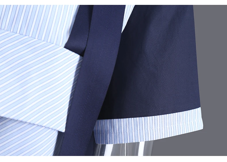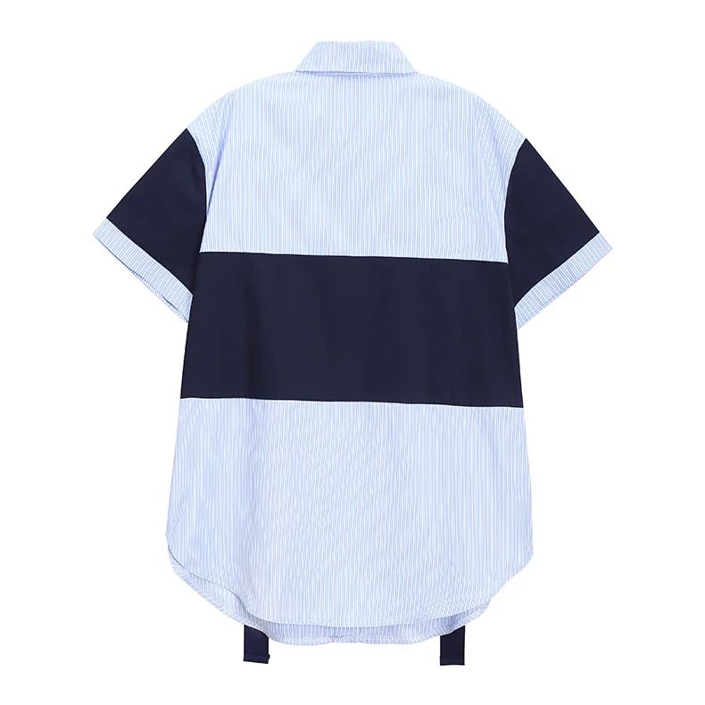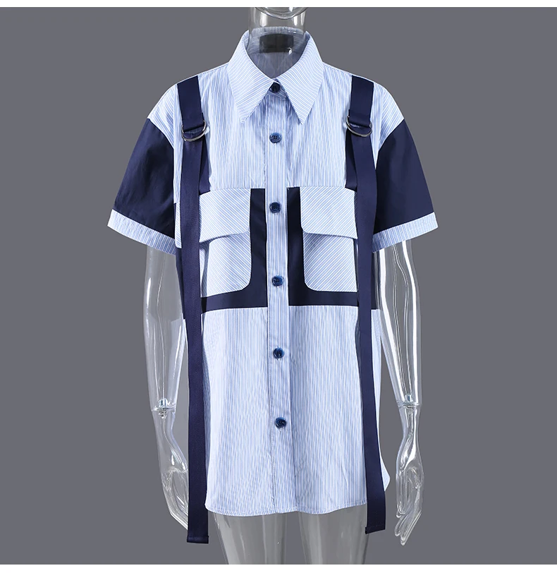 Новинка, женские летние дизайнерские синие Лоскутные Блузы больших размеров и с карманами, повседневная одежда, женская рубашка с коротким рукавом, Стильная сорочка, femme 8435