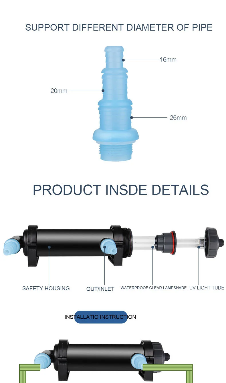 Напряжение: 220 ~ 240 В переменного тока Мощность: 5 Вт (35 ~ 60 галлонов) 7 Вт (40 ~ 75 галлонов) 9 Вт (45 ~ 150 галлонов) 11 Вт (60 ~ 180 галлонов) 13 Вт (75 ~ 200 галлонов) 18 Вт (90 ~ 220 галлонов) 24 Вт (120 ~ 300 галлонов) 36 Вт (150 ~ 350 галлонов) Рабочий час в день: 6 часов Максимальный расход воды: 350 л/ч (5 Вт) 350л/ч (7 Вт) 350л/ч (9 Вт) 550л/ч (11 Вт) 600л/ч (13 Вт) 600л/ч (18 Вт) 650л/ч (24 Вт) 700л/ч (36 Вт)