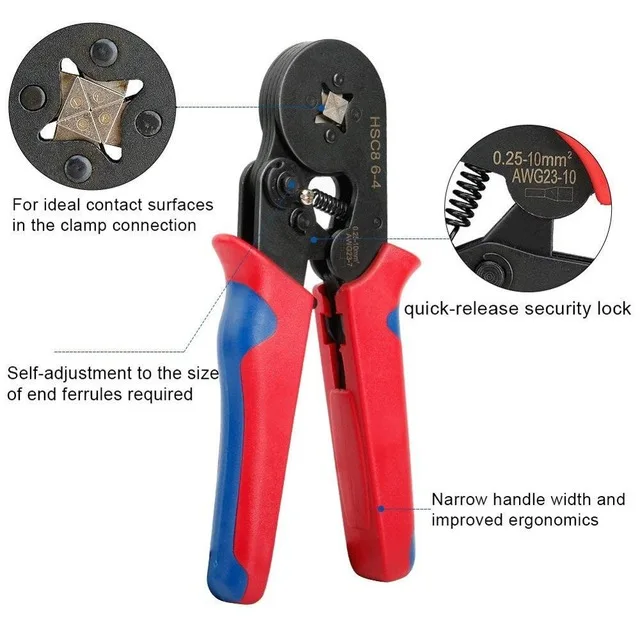 Описание:HSC8 6-4/6-6 0,25-6 мм2 AWG10-23 обжимные плоскогубцы инструмент с 800 шт. кабельных клемм комплект соединителейОсобенности:Регулируемая конструкция колеса с трещоткой и действие рычага снижает степень усталости работы.Специальная конструкция ручки, усиление хвата.Уникальный дизайн четырехшпиндельного обжимного типа.Высокое качество, высокая гарантия.Предохранительный замок быстрого подъема.Применение: клемма гильзового типаСпецификация:Наименование: Обжимные ЩипцыМатериал: нейлонДиапазон обжима: 0,25-6, 0 мм2AWG: 23AWG - 10AWGПосылка тация включает:Инструмент и коннектор 800 x