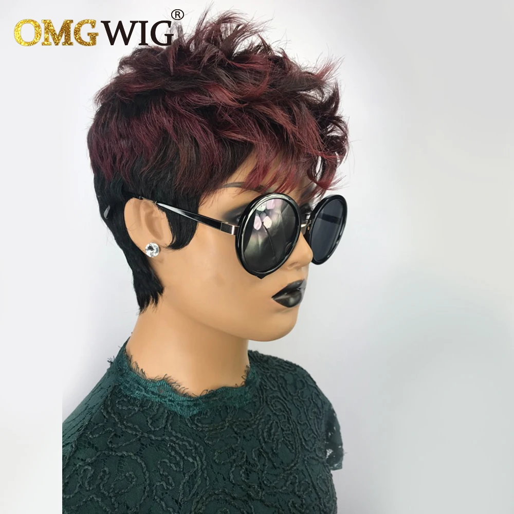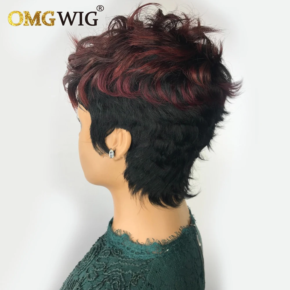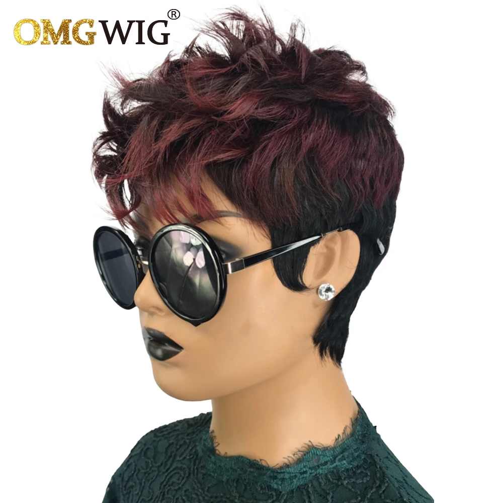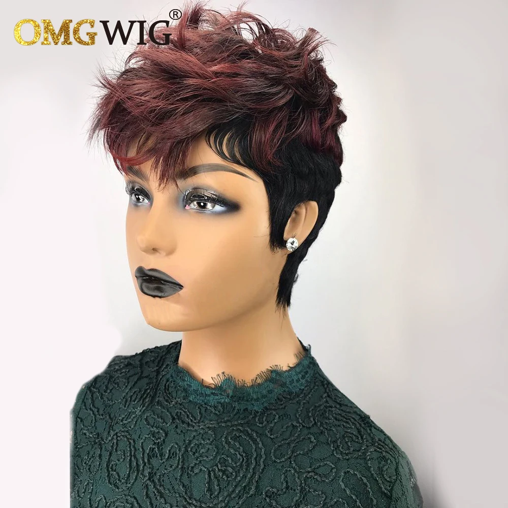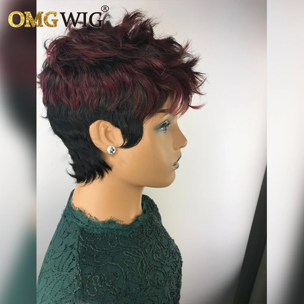 Оптовые человеческие волосы, короткие парики для черных женщин, волнистые парики Pixie Cut 1B/99J, бордовые бразильские волосы Remy, бесклеевые парики с челкой