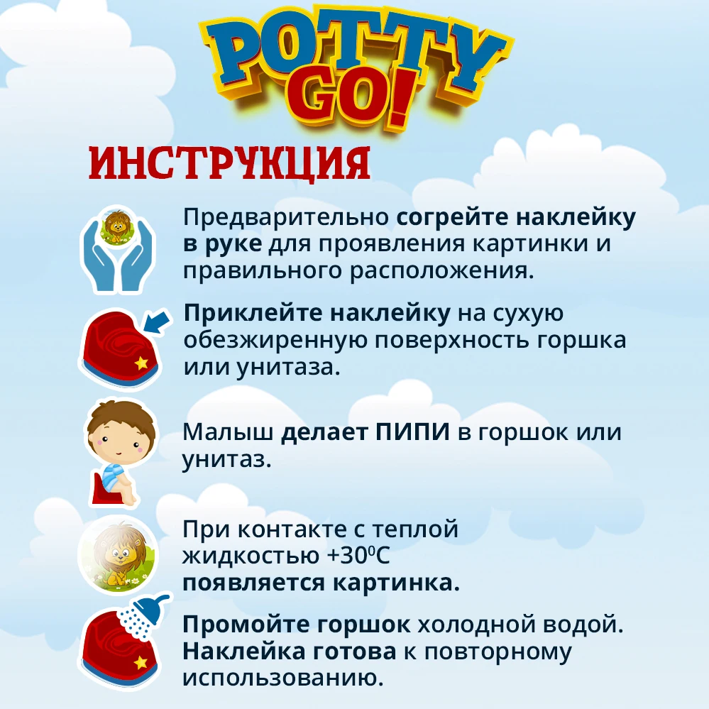 Как работает обучающая наклейка PottyGo!: при попадании теплой жидкости на наклейку появляется веселая картинка, которая исчезает после высыхания (или ополаскивания под холодной водой) и снова появляется при контакте с теплой жидкостью. СОСТАВ: 100% термовинил, не впитывает запахи. Срок действия одной наклейки 20 недель. Подходит для всех типов горшков.