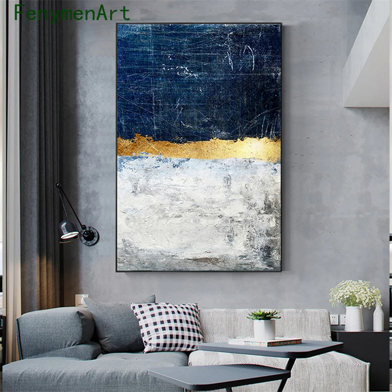 Абстрактная Золотая фольга, холст, живопись, синий, белый плакат, Современная Золотая Настенная картина для гостиной, домашний декор