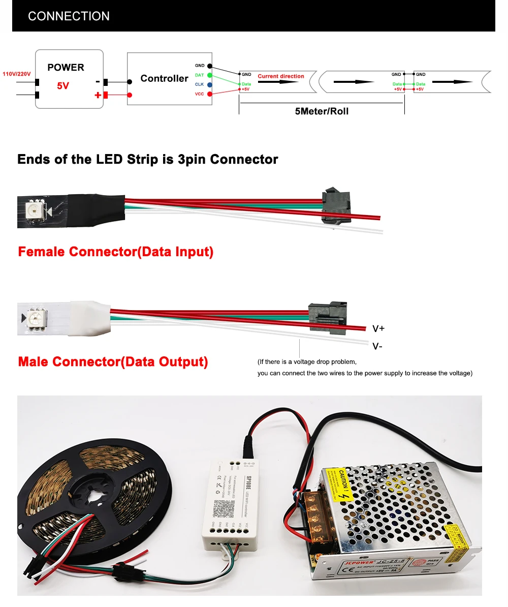 3. WS2812B Светодиодная лента должна работать с DC5V, и ей должен быть нужен WS2812B светодиодный контроллер управления
