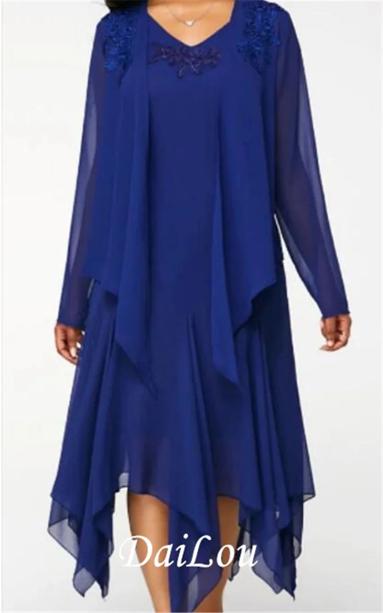 Элегантное шифоновое платье для матери невесты, из двух предметов, с V-образным вырезом, длиной до колен, кружевными длинными рукавами и драпировкой, 2021