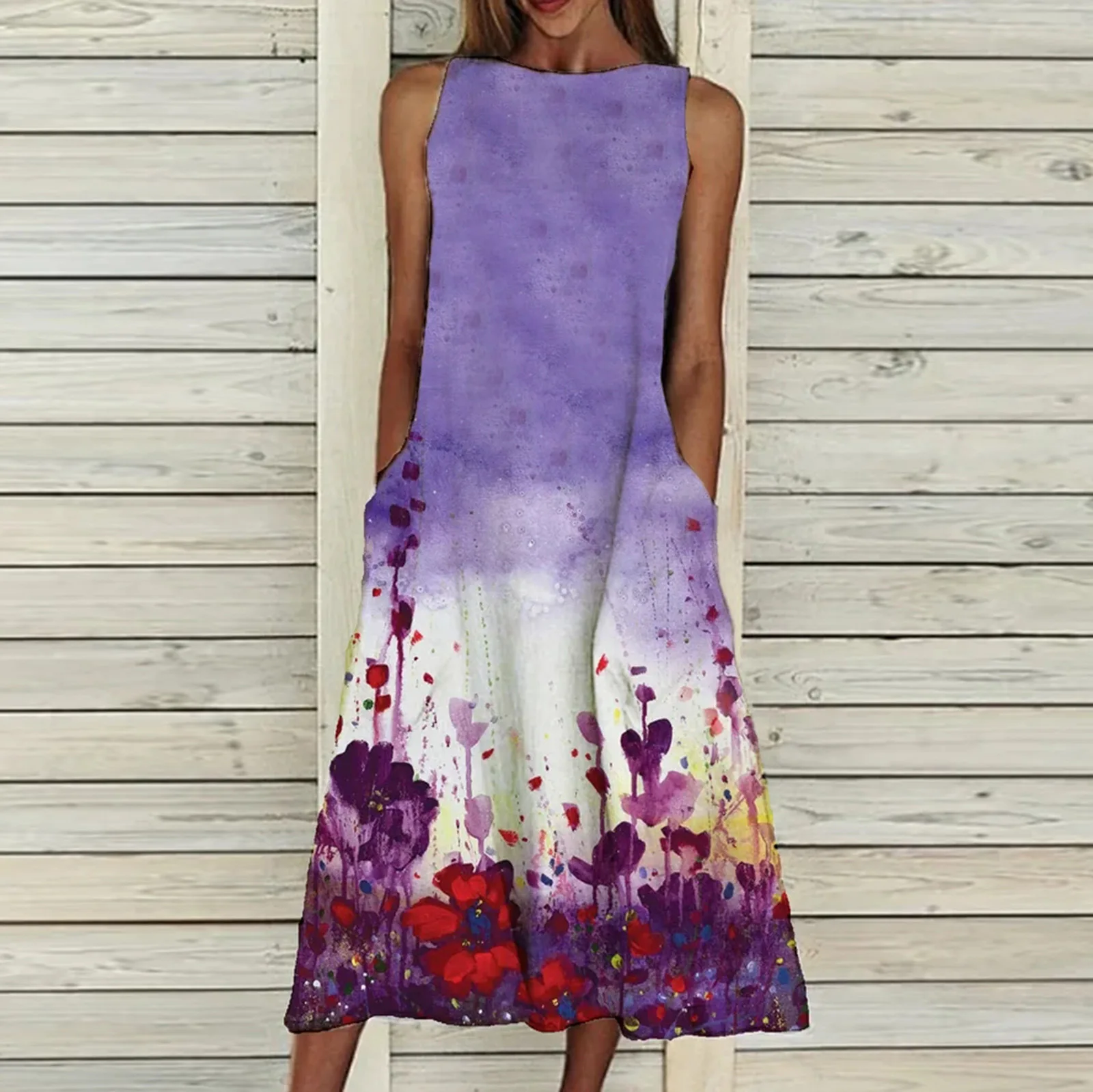 Платье-трапеция женское средней длины без рукавов, Повседневное платье с цифровым принтом, в богемном стиле, фиолетовое платье для вечеринки, на лето