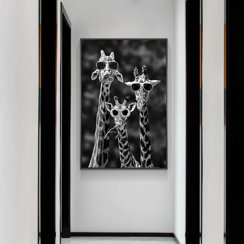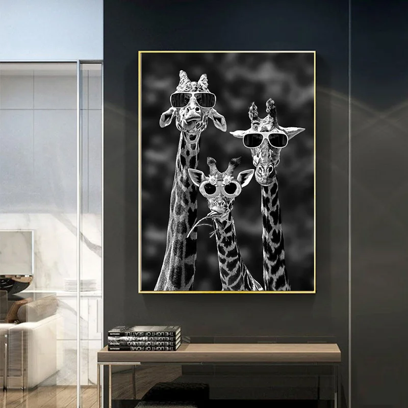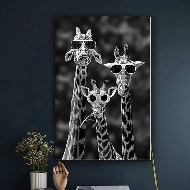 Жирафы с солнцезащитными очками, забавные художественные картины на холсте, плакаты и принты с черно-белыми животными, настенные художественные картины для домашнего декора