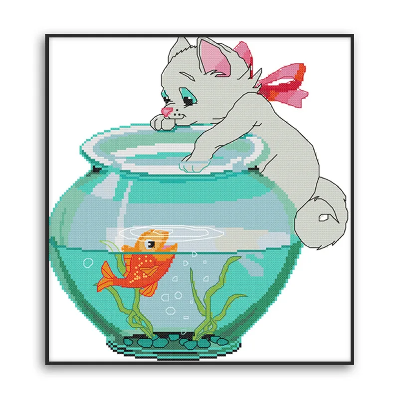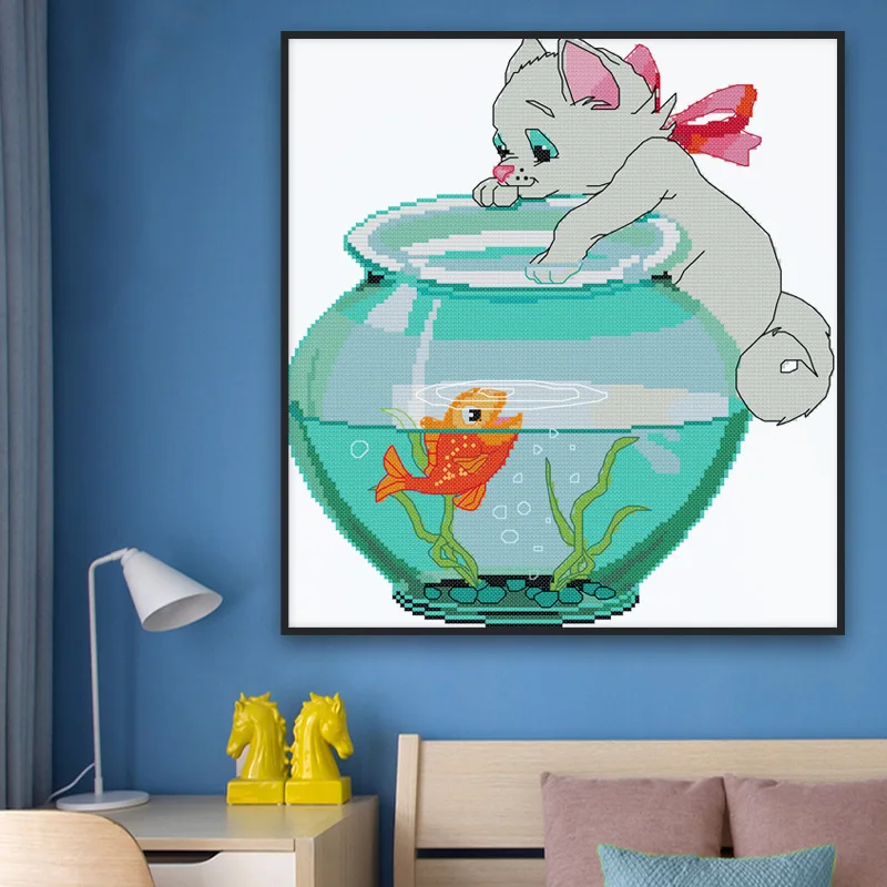 Напечатанная вышивка крестиком котенок рядом с аквариумом самовышитая Ткань Искусство DIY декоративная живопись картины на холсте наборы Nkf