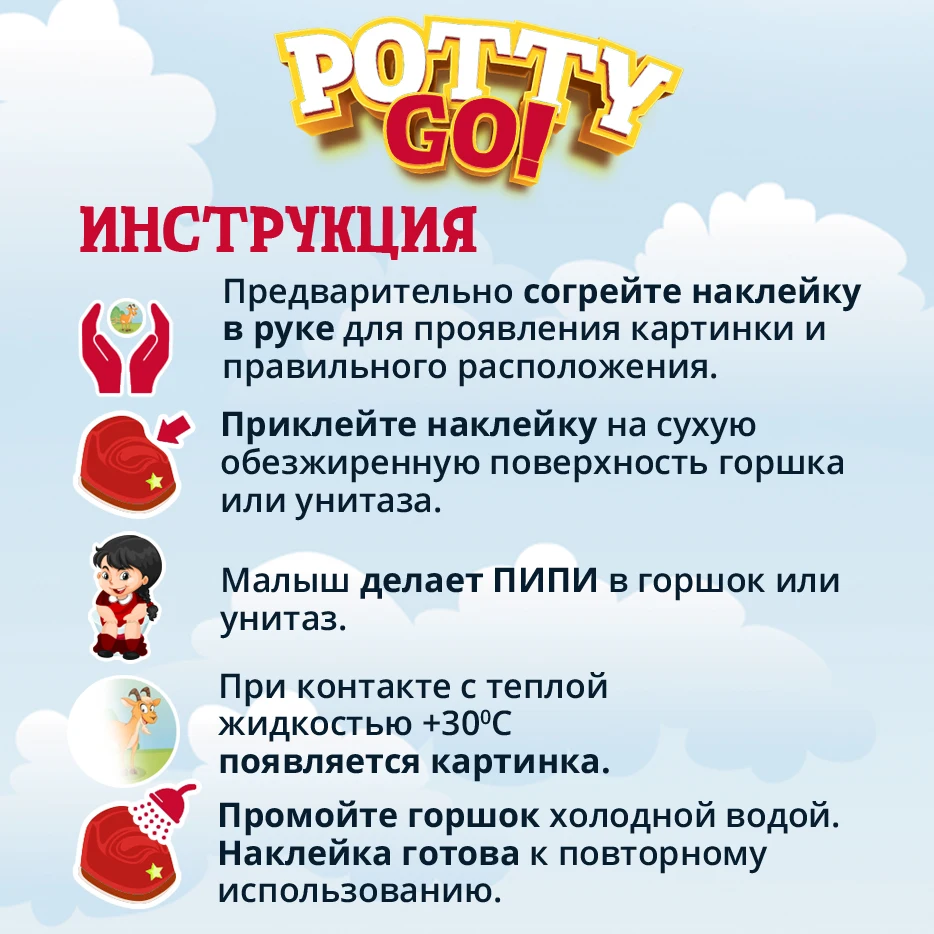 Как работает обучающая наклейка PottyGo!: при попадании теплой жидкости на наклейку появляется веселая картинка, которая исчезает после высыхания (или ополаскивания под холодной водой) и снова появляется при контакте с теплой жидкостью. СОСТАВ: 100% термовинил, не впитывает запахи. Срок действия одной наклейки 20 недель. Подходит для всех типов горшков.