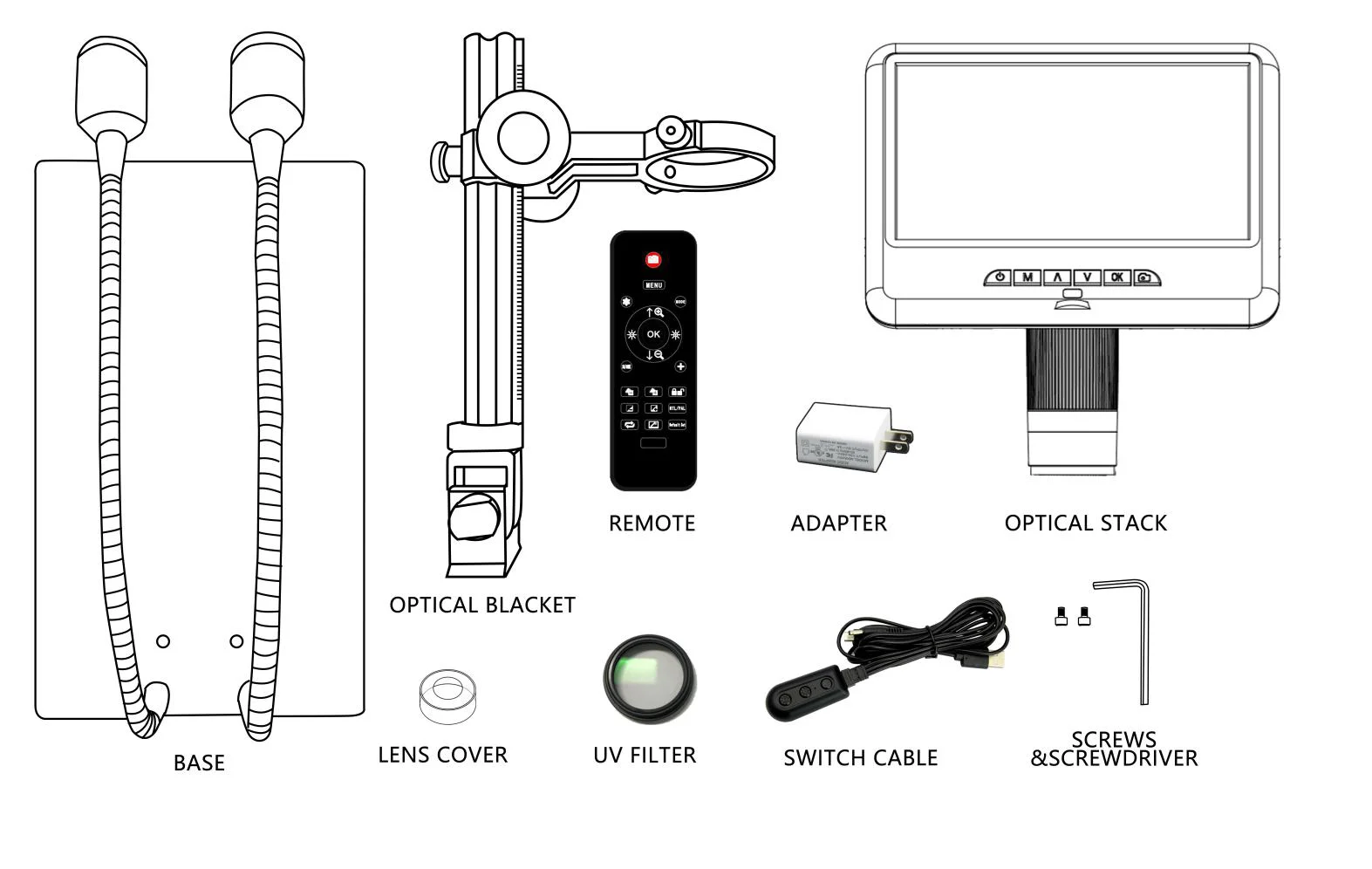 Что в коробке:Микроскоп * 1Кронштейн * 1Кабель переключателя * 1УФ-фильтр * 1Крышка объектива * 1ИК-пульт * 1 (без батареи)Адаптер питания * 1Винт и отверткаИнструкция * 1