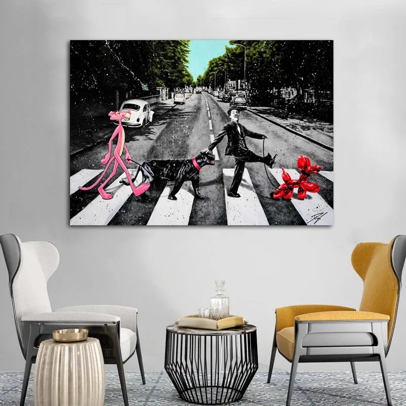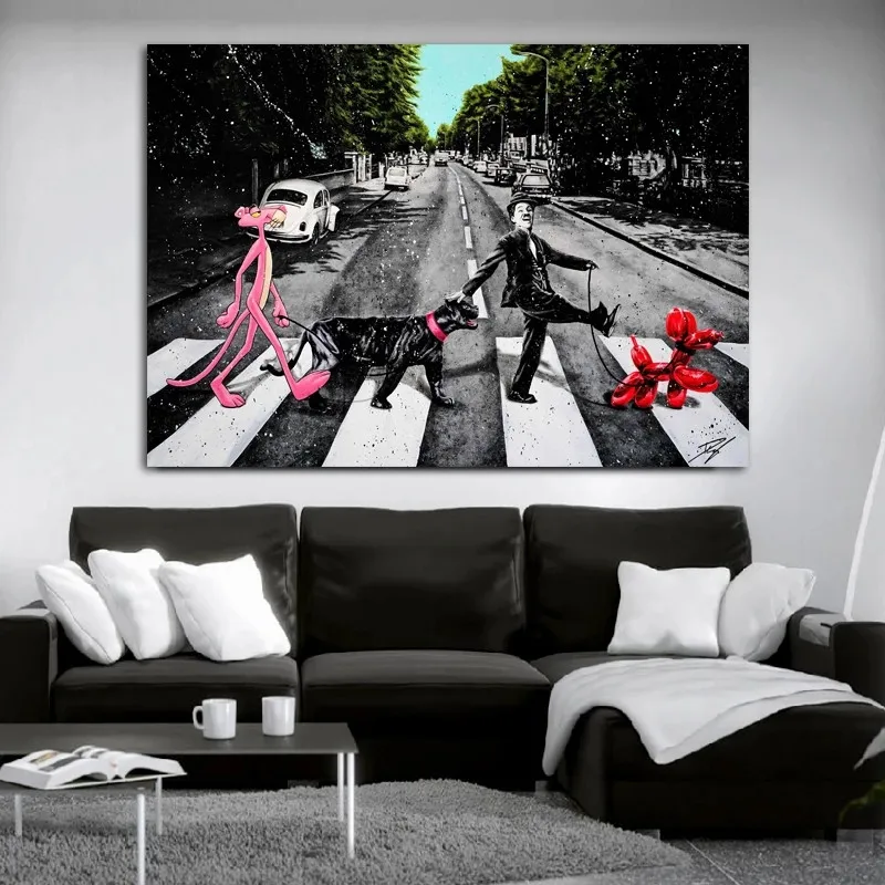 Плакаты с изображением розовой Пантеры, черно-белых собак, прогулок по дороге, граффити, уличная живопись, настенные картины для декора гостиной