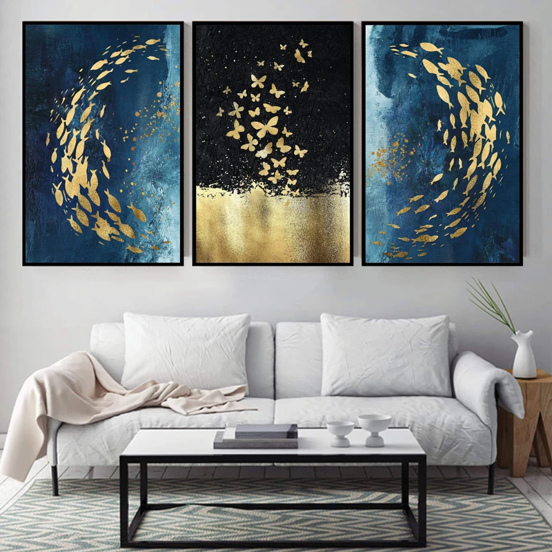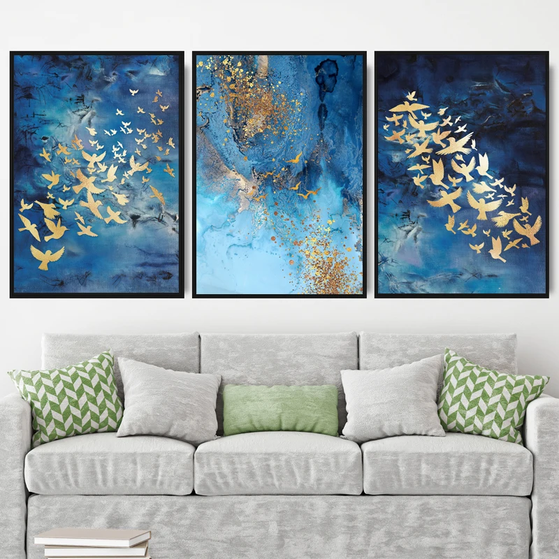 Скандинавский абстрактный синий океан, холст, живопись, золотой гол...