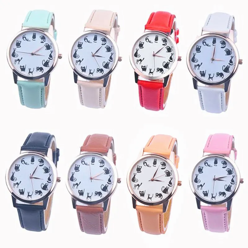 2021 Модные женские повседневные часы с кошачьим узором кожаный ремешок кварцевые часы круглые аналоговые часы наручные часы Элегантные часы