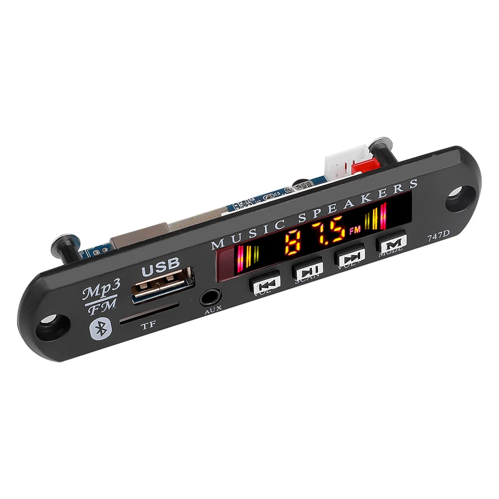 Технические характеристикиМодель: M15B Bluetooth версии 5,0. Поддержка воспроизведения музыки без потерь, с функцией защиты питания(Обратное соединение не сгорит материнскую плату, и дисплей не включит светильник)Инфракрасный Прием: может совпадать с инфракрасным пультом дистанционного управленияTF: слот для карт, подключенный к tf-карте памяти (максимальная поддержка 32 Гб);Экран: цифровой цветной экран, красный (возможно изготовление на заказ цветного экрана);AUX: аудио входной интерфейсИнтерфейс USB: подключение к u-диску (максимальная поддержка 32 Гб);VOL-: Короткое нажатие на предыдущую песню в режиме USB/SD; Короткое нажатие на предыдущую станцию в fm-режиме и длительное нажатие на громкость для уменьшения.Сканирование: короткое нажатие для воспроизведения/паузы в состоянии USB/SD, длительное нажатие для автоматического сканирования радиостанций в FM состоянии;VOL +: Короткое нажатие на песню в режиме USB/SD; Короткое нажатие на радиостанцию в FM состоянии и Длительное нажатие на громкость для увеличения;Режим: когда есть sd-карта и u-диск: последовательность переключения-usb→ sd→ fm→ aux→ usb; Когда есть только u-диск: последовательность переключения-usb→ fm→ aux→ usb; Когда есть только sd-карта: последовательность переключения sd→ fm → aux→ SD;IC Главного управления: AB5362BBluetooth IC: AB5362B версия Bluetooth 5,0Формат музыки: MP3 / WMA / WAV и другие форматы без потерьРадио FM частота: 87,5-108,0 МГцПоддержка функции: поддержка MP3 / USB / TF / LINE IN / FM / BLUETOOTH/дистанционное управление/DC 5 В или 12 В (максимум 5 в не может превышать 5 В; максимум 12 В не может превышать 16 В, теория не превышает 24 В может быть настроена на выбор,)О конструкции: Размер панели: 106*25 мм, две стороны панели-это положение отверстия для винтов, ширина платы-19,8 мм, глубина платы составляет 24 мм