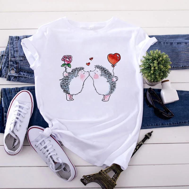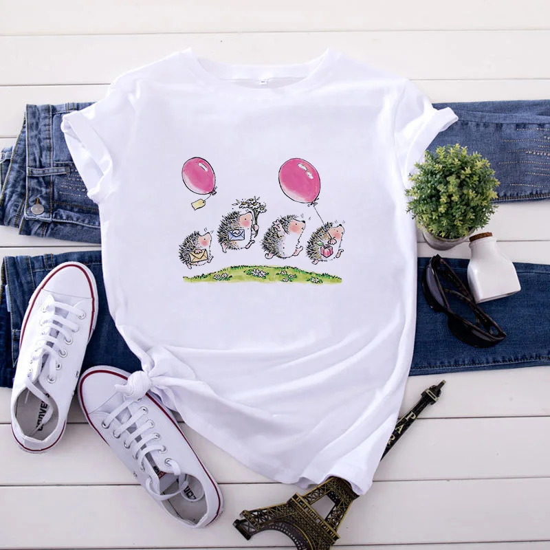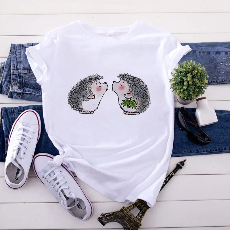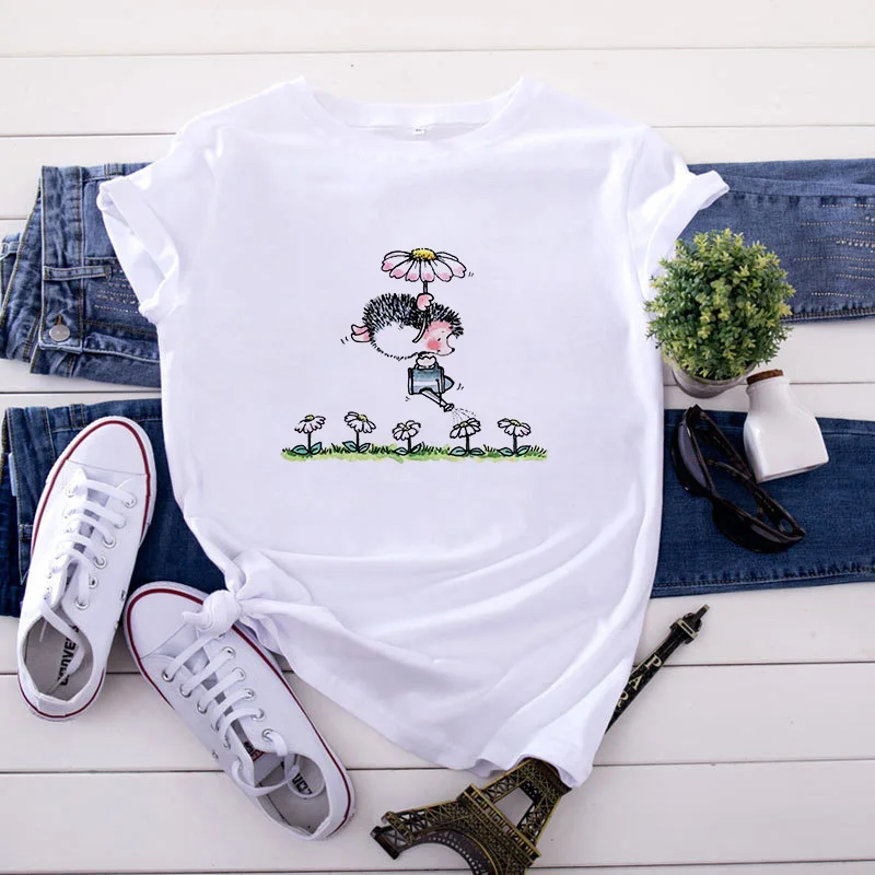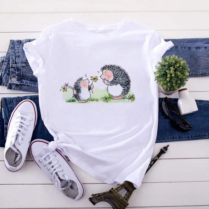 Футболка с принтом ежика, с круглым вырезом, удобная повседневная, 2021, женская летняя футболка
