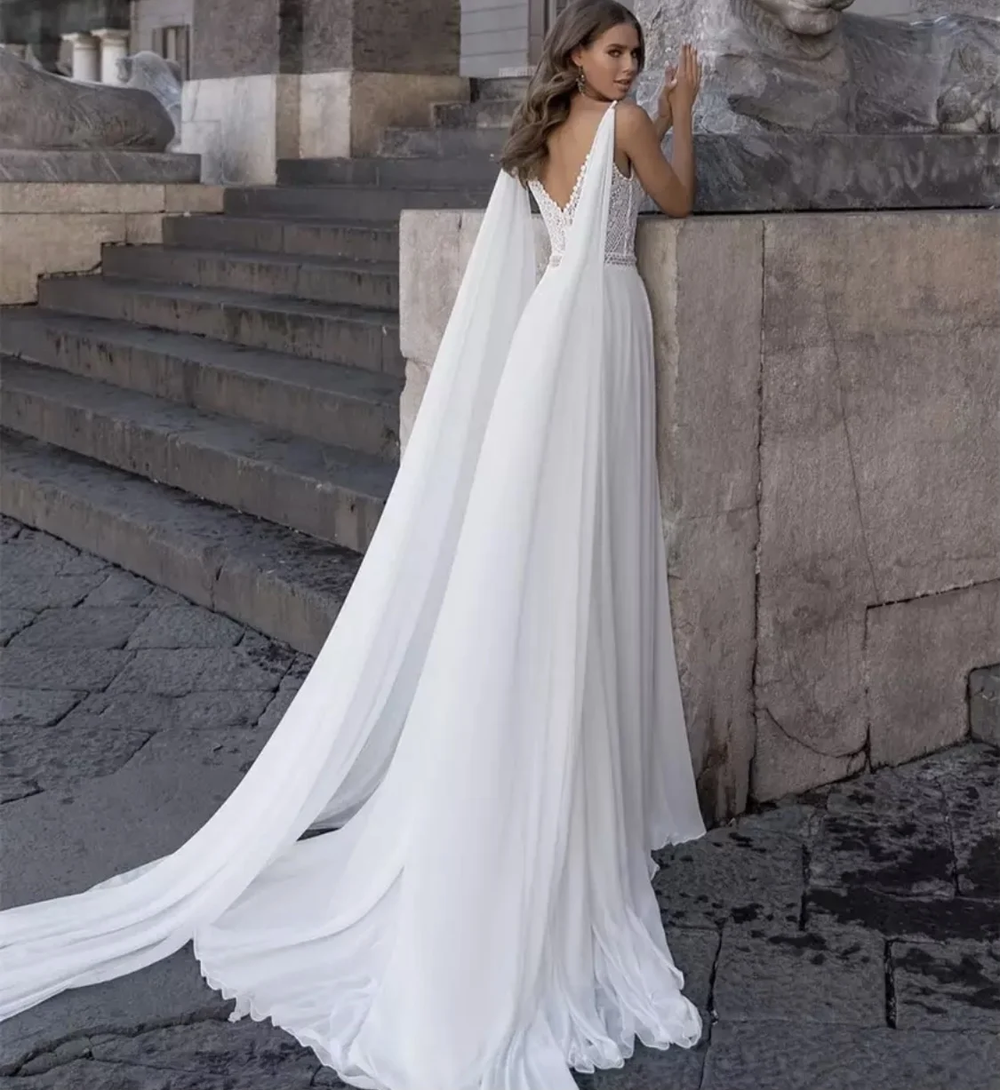 Без рукавов с вырезом в форме буквы V свадебное платье А-силуэта с боковыми на тонких бретелях Кружева Аппликации открытая спина пол Длина развертки поезд невесты Новый