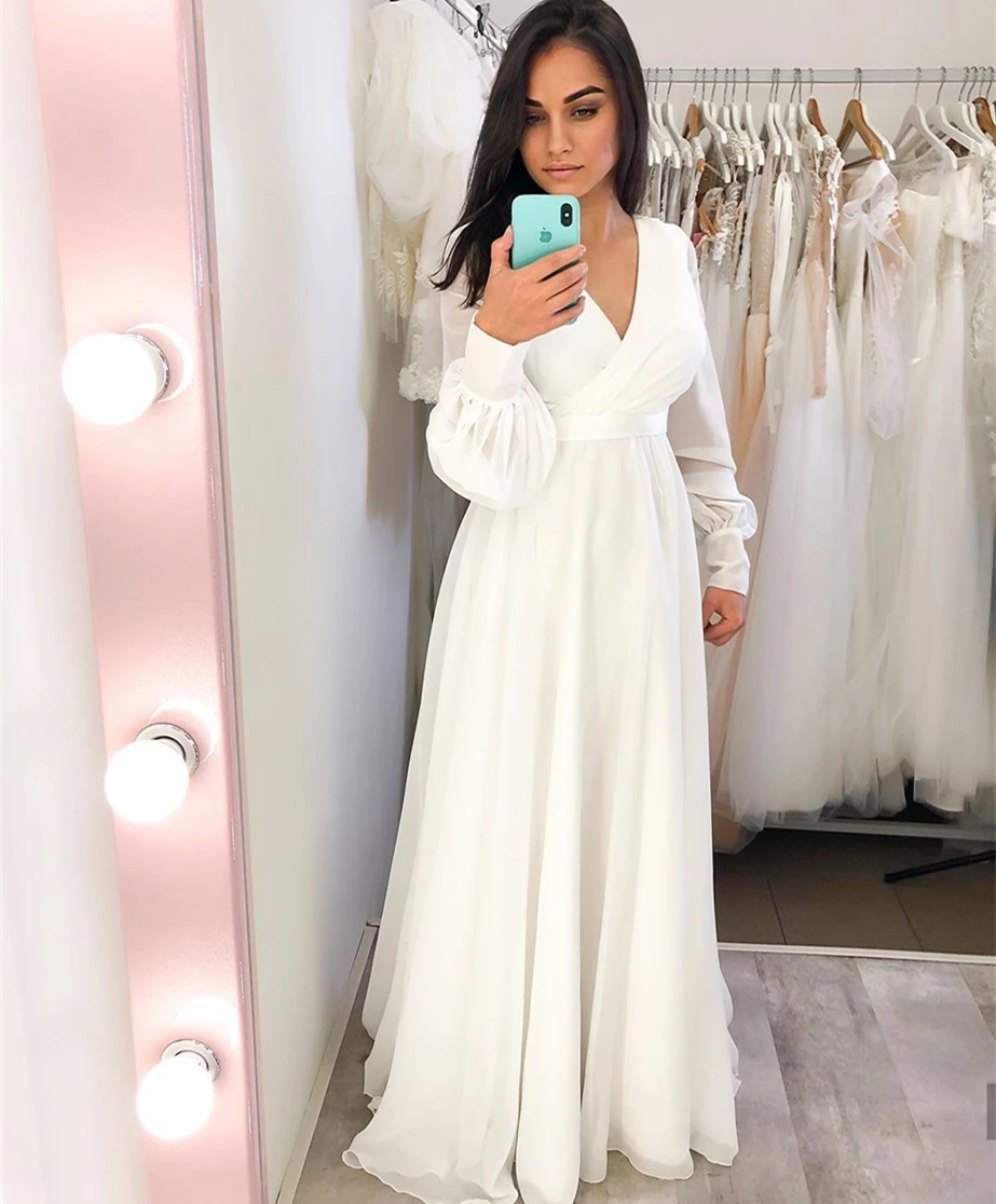 Простое шифоновое свадебное платье, а-силуэт, v-образный вырез, рукава-фонарики, шнуровка, простая, белая, слоновая кость, длина до пола, официальное платье невесты, индивидуальный пошив, новинка