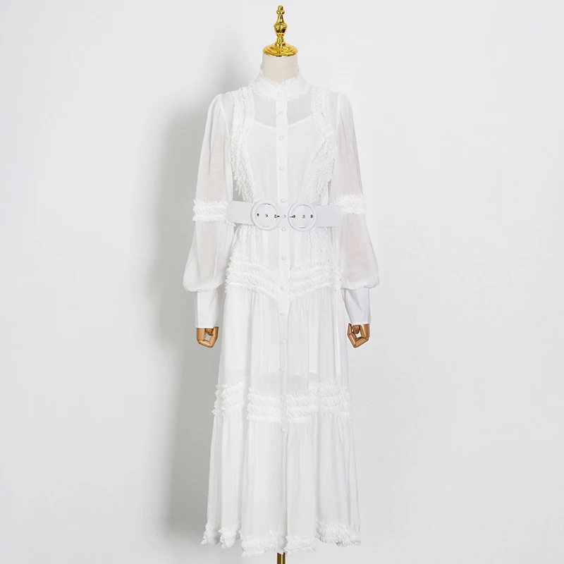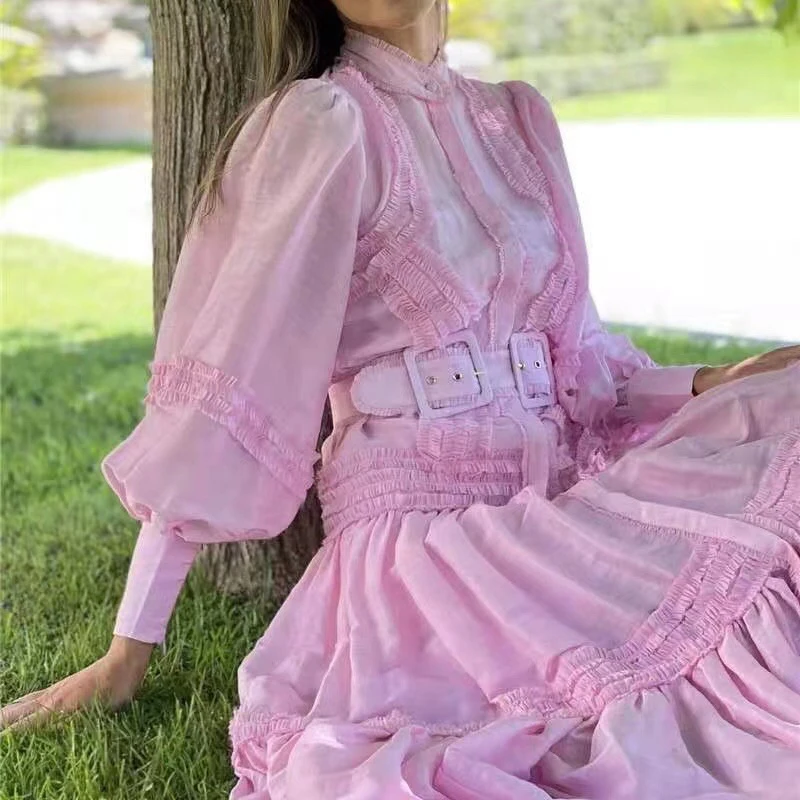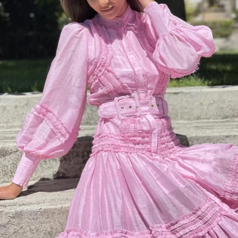 Женское платье с рюшами ONEINALL, однотонное длинное платье с рукавами-фонариками, высокой талией и поясом, весна 2021