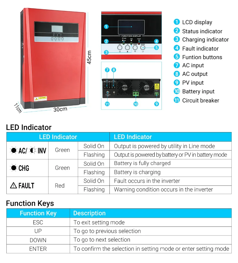 Это многофункциональный инвертор/зарядное устройство, которое сочетает в себе функции инвертора, солнечного зарядного устройства и зарядного устройства для обеспечения бесперебойного питания с портативным размером. Его полный ЖК-дисплей предлагает пользовательский настраиваемый и легкий доступ к кнопкам, таким как ток зарядки аккумулятора, приоритет переменного/солнечного зарядного устройства, и приемлемое входное напряжение на основе различных приложений.