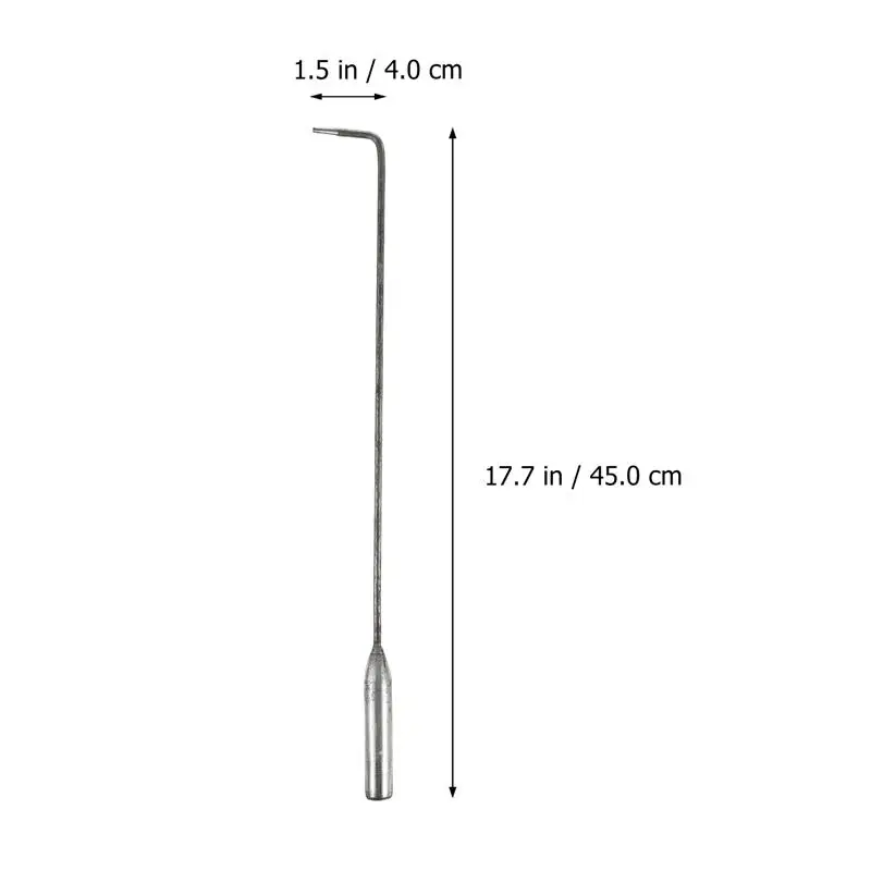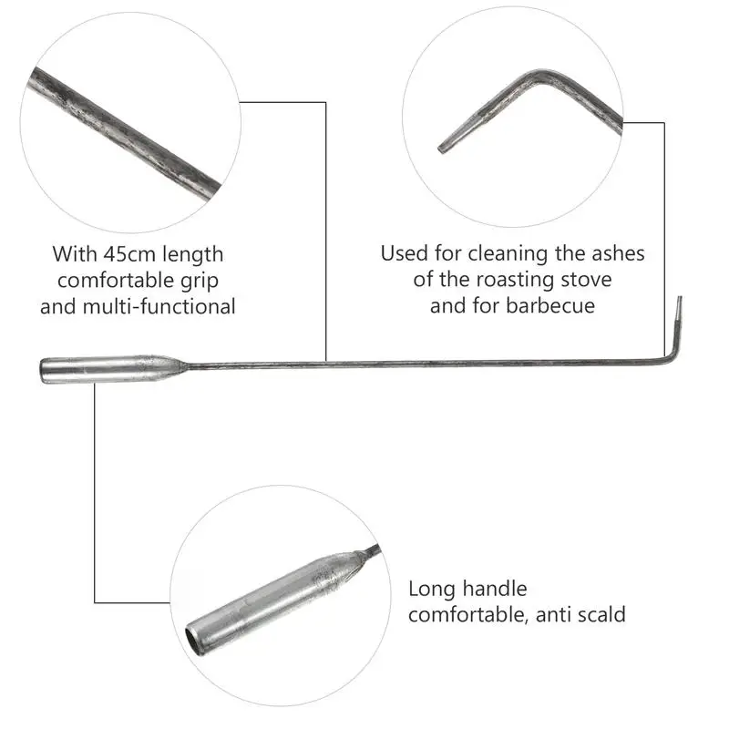 17,68x1,57x0,79 дюйма.-Изготовлен из высококачественной нержавеющей стали, прочный.-Используется для очистки золы печи и барбекю.-Длинная ручка, удобная и устойчивая к ожогам.-Может использоваться для уборки мусора. Практичный и красивый.-Идеально подходит для высокотемпературного перемещения золы пожарной печи, чистка мусора или использования крючка двери затвора.