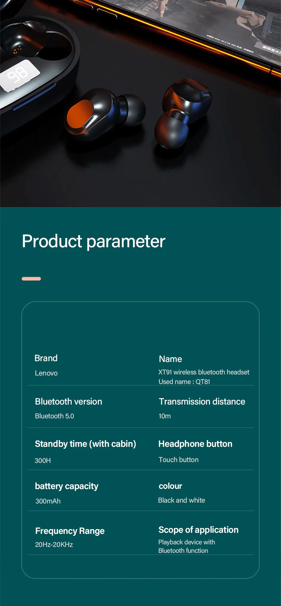 Оригинальные беспроводные Bluetooth-наушники Lenovo XT91 TWS с сенсорным управлением, музыкальные наушники с шумоподавлением, водонепроницаемые наушники с микрофоном