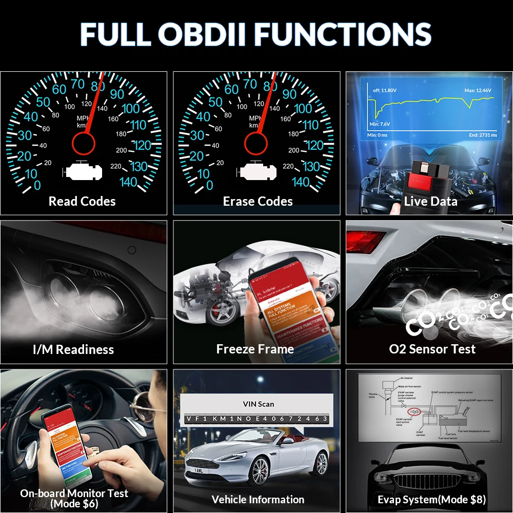 Функции: 1. Все системы с полным функционалом диагностики, чтения кодов ошибок системы, и четкие коды ошибок системы 2. Считывание информации о транспортном средстве автоматически 3. Начните общаться с ECU, сканирование кодов неисправностей 4. Считывайте данные автомобиля в реальном времени и представляйте по графику. Дополнительное сочетание нескольких данных. 5. Создание диагностического отчета