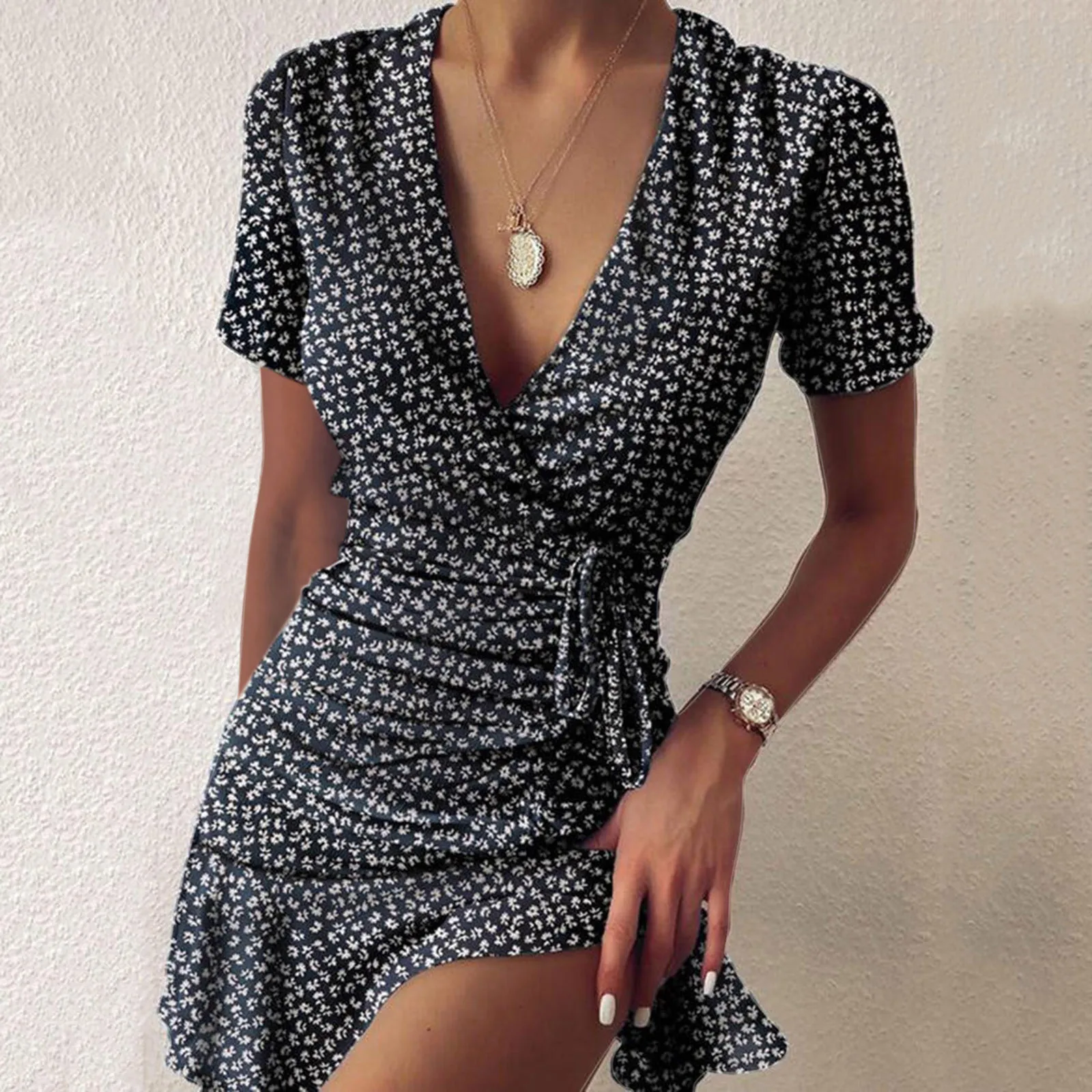 Женское мини-платье с глубоким V-образным вырезом и цветочным принтом