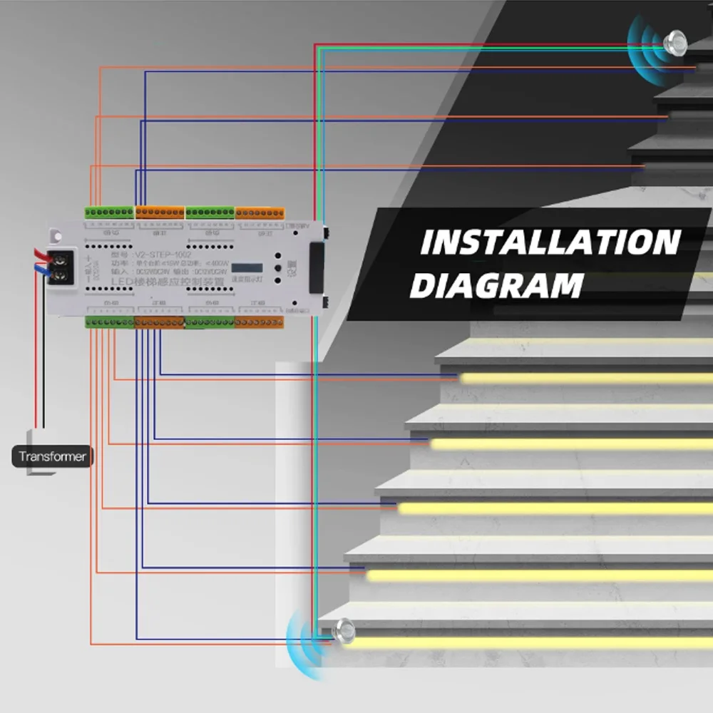 1-A/B датчики должны быть установлены на входе и выходе из лестницы и лицом к телу человека.2-продукт низкого напряжения 12V-24V, подключите к сети питания трансформатор. Не подключайте напрямую 220 В, это сгорит контроллер.3. Изделие не является водонепроницаемым.