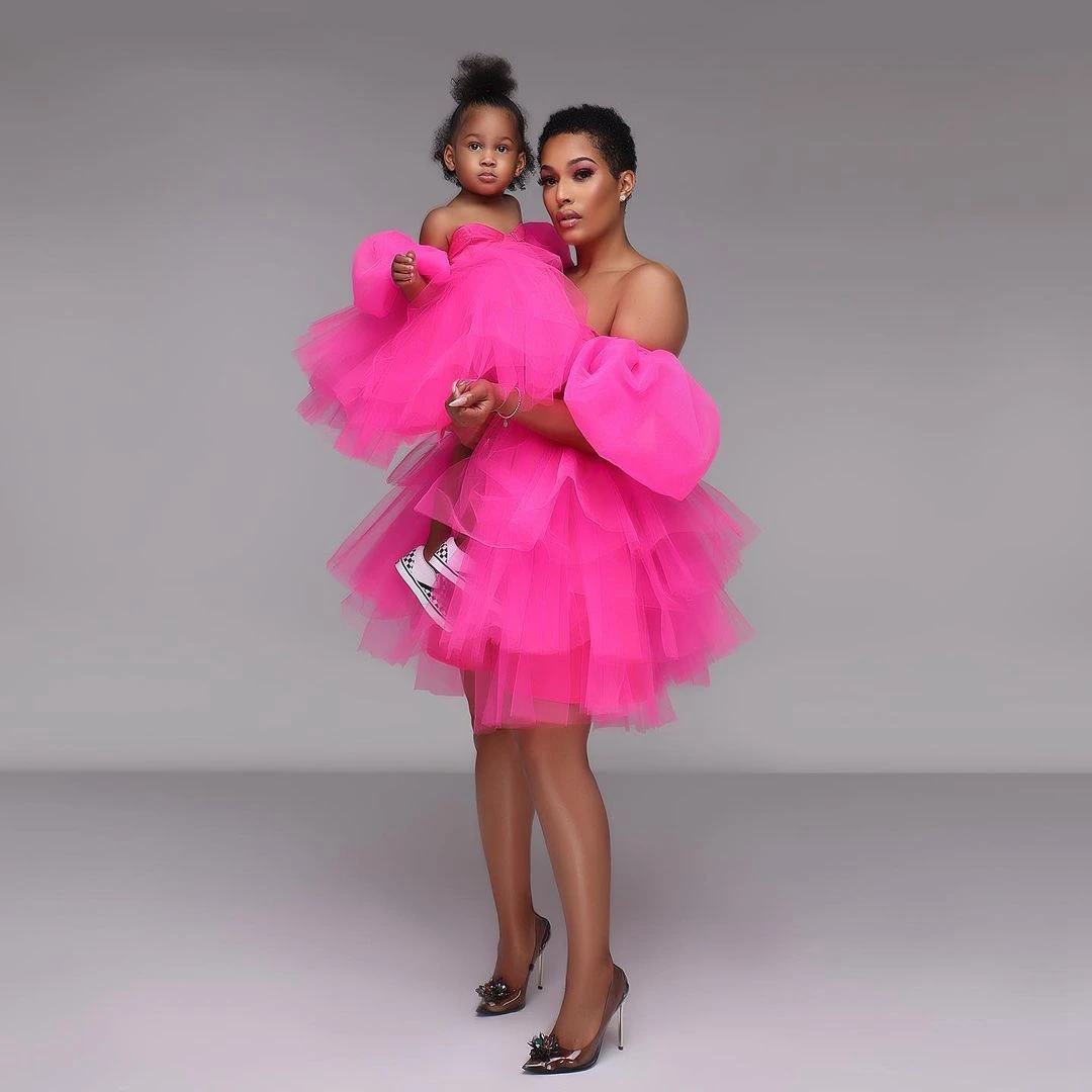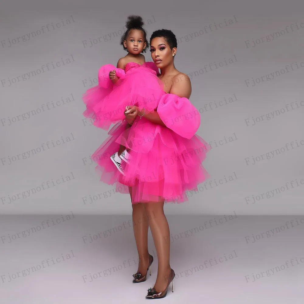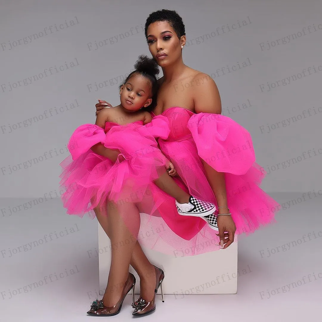 2021 Очаровательные платья из фатина для мамы и дочки, вечерние платья из фатина цвета фуксии с открытыми плечами для мамы и детей, вечерние платья