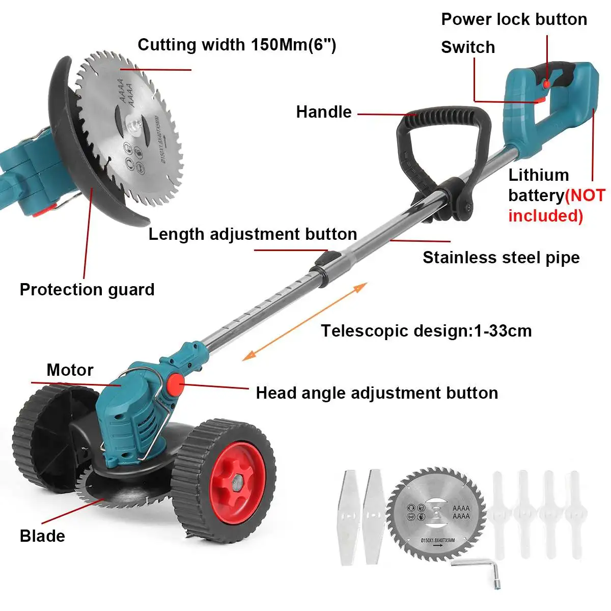 Особенности -Триммер беспроводной, потому что он перезаряжаемый. Больше нет громоздкой и громоздкой проводки (батарея в комплект не входит)-Масштабируемый, удобный для переноски, можно растянуть 99-135 см в длину-Триммер не использует топливо, он экономит ресурсы и деньги и является экологически чистым.-Головку можно отсоединить до размера, который вы носите с собой, что упрощает обрезку.-Многоугольная Регулировка режущей головки, подходит для различных сцен, скашивания, обрезки и озеленения, более удобна в использовании, удобна Кнопка регулировки угла наклона-Дополнительная ручка для бесплатной регулировки.-Легко работать