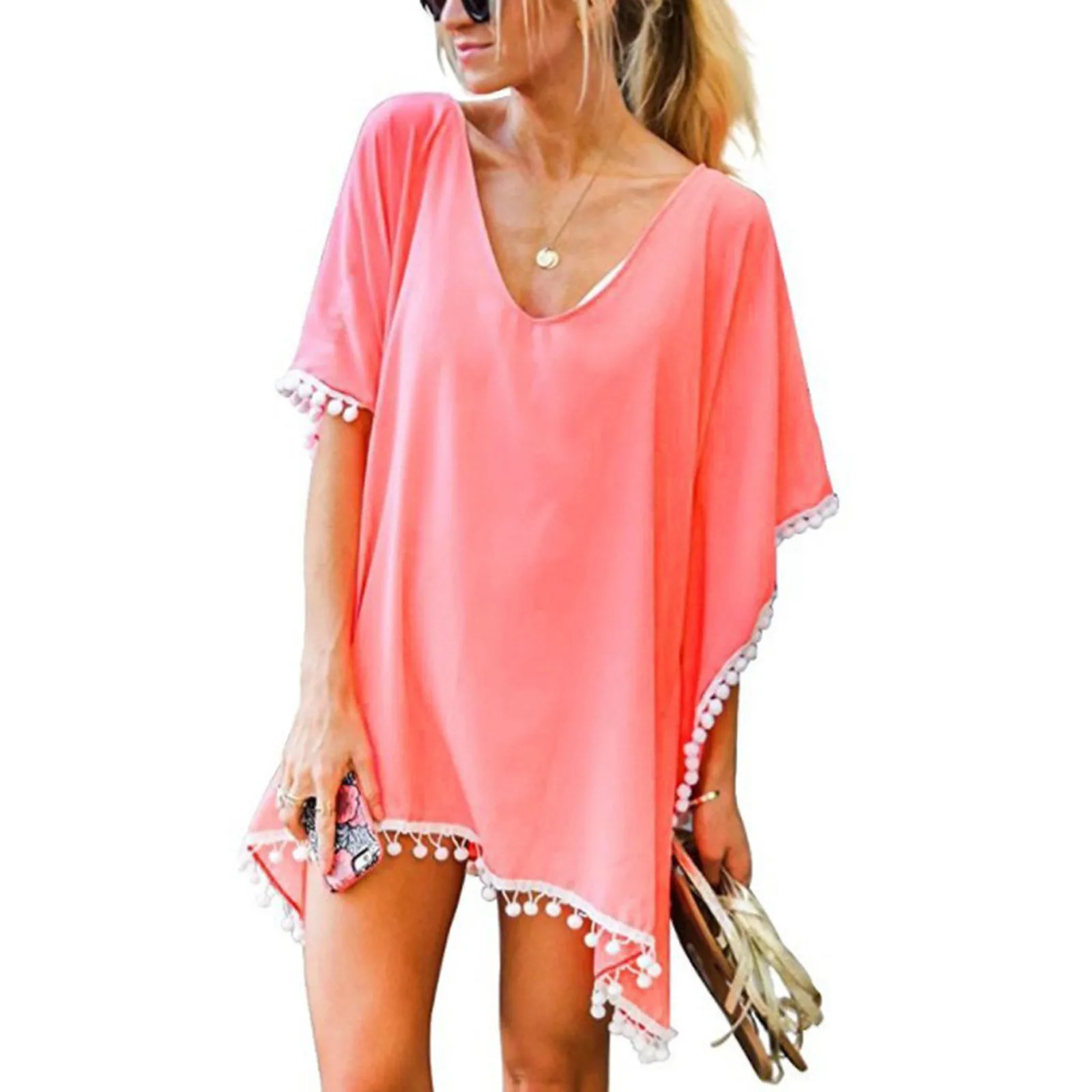Женское пляжное платье, однотонная накидка, пляжная одежда, женский купальник с кисточками, с коротким рукавом, шифоновая накидка для купания, Пляжная женский