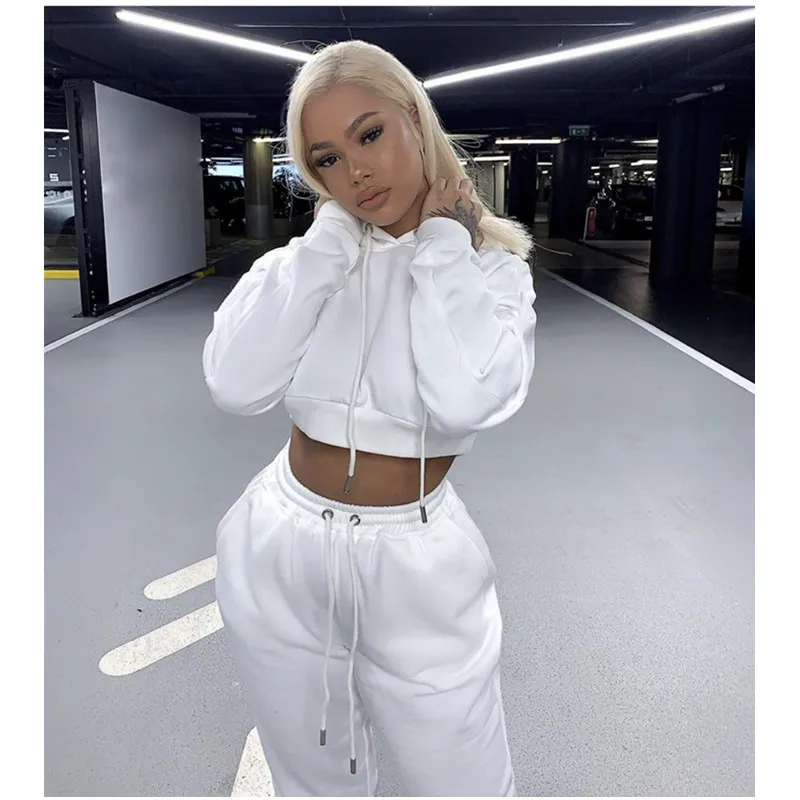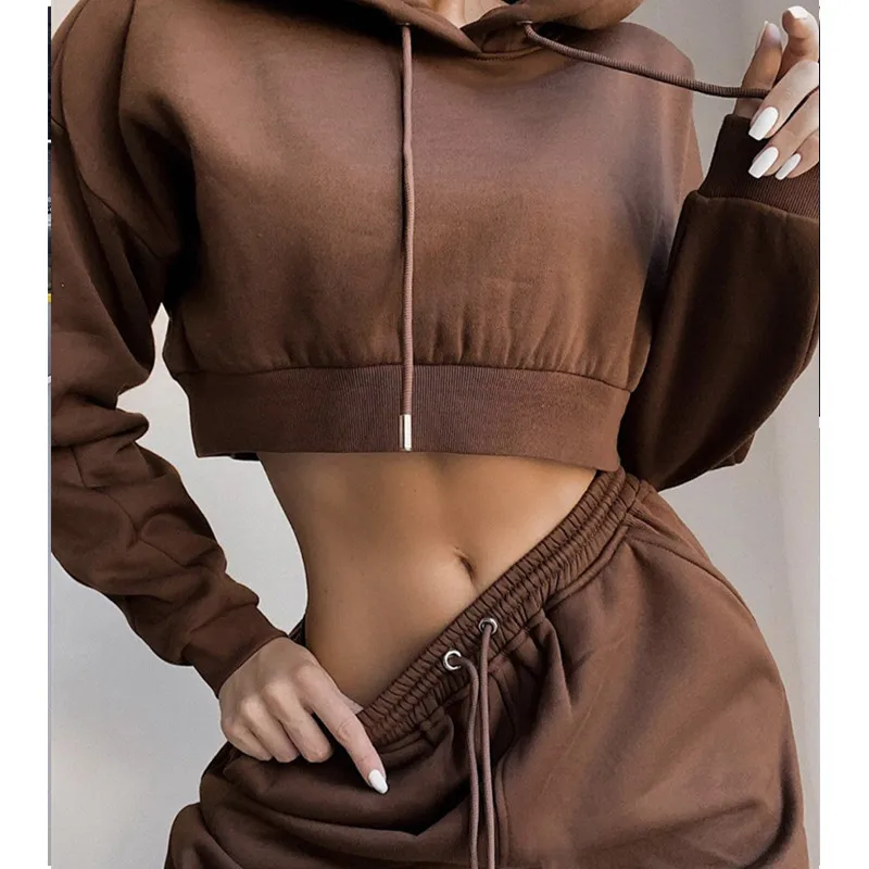 Повседневный комплект из двух предметов, Женская толстовка, однотонный короткий топ и длинные брюки, спортивная одежда, женский сексуальный спортивный костюм, свободный комплект из двух предметов