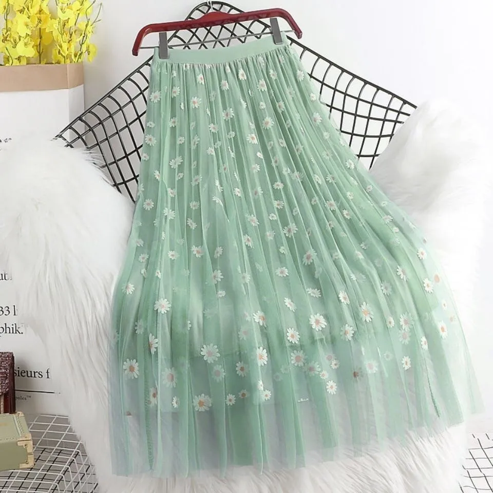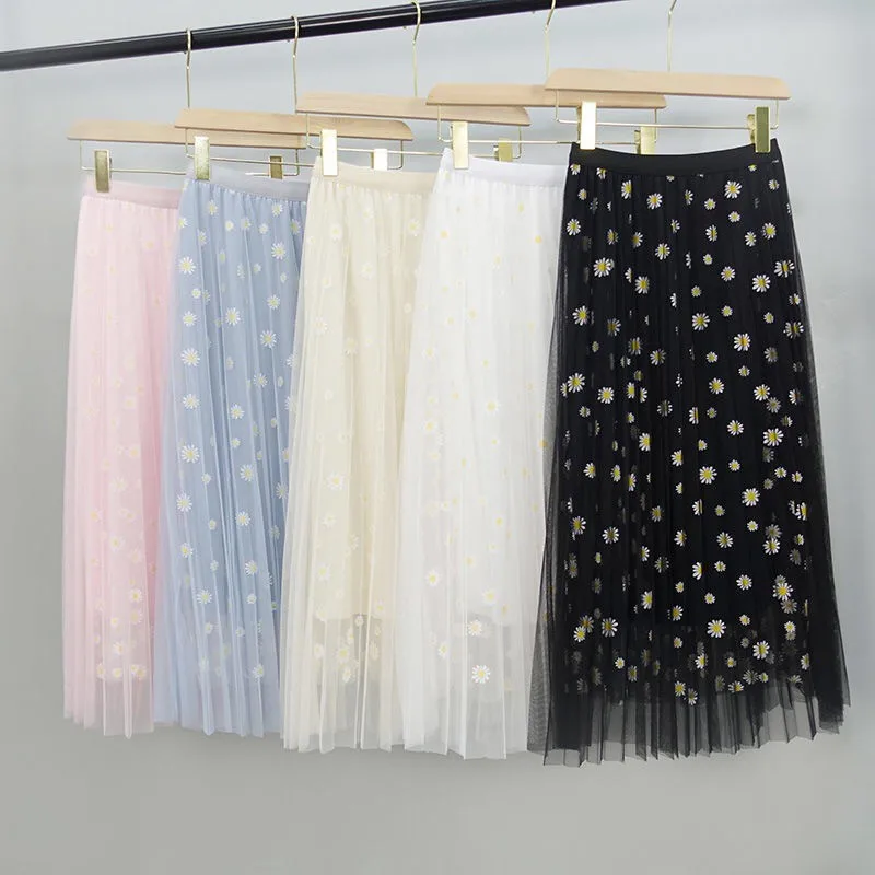 VmewSher новые летние сандалии на танкетке с декоративным цветочным рисунком и с принтом в виде ромашек для женщин юбка Йен Цветочные женские Элегантный цветочный эластичная юбка с завышенной талией, плиссированные юбки из сетчатой ткани