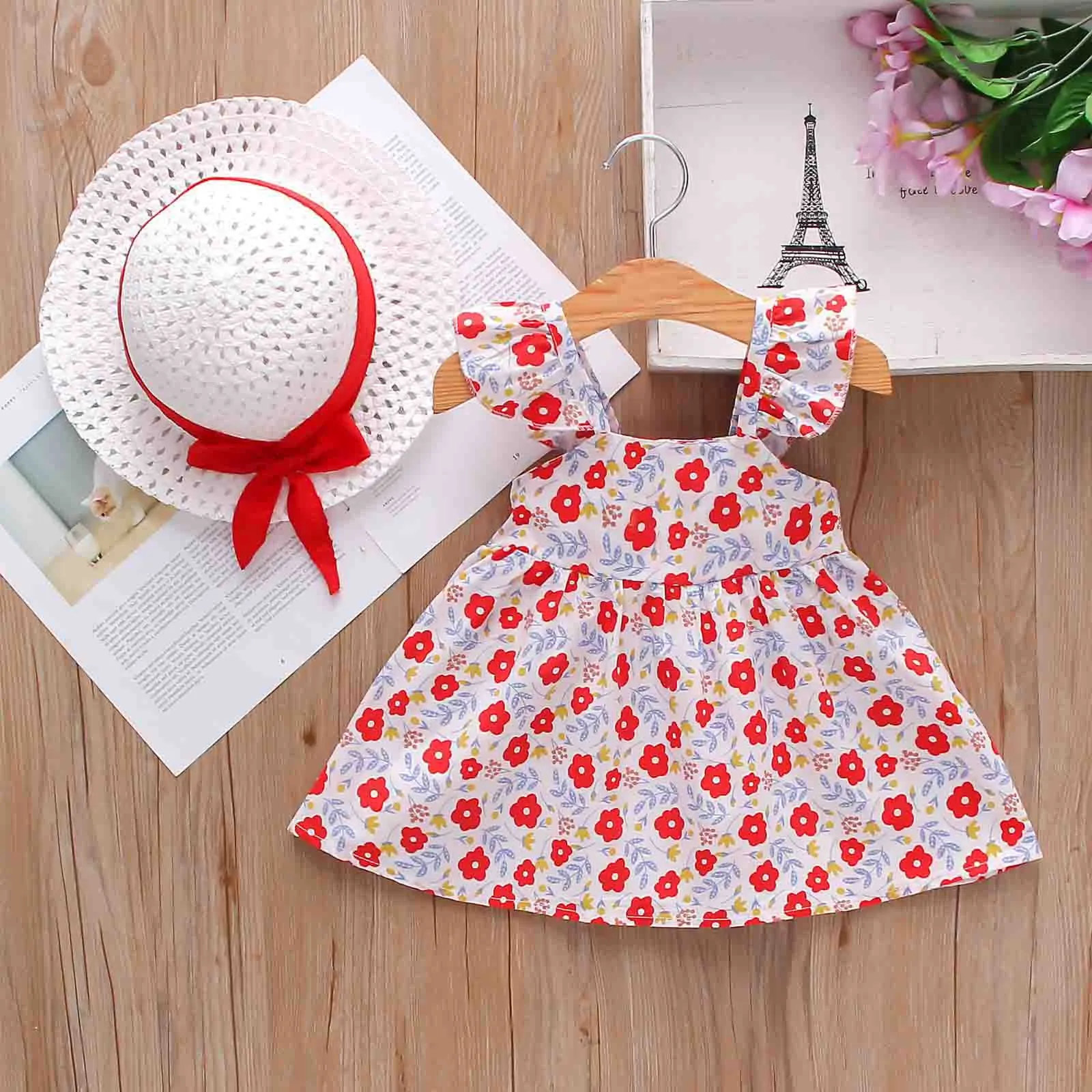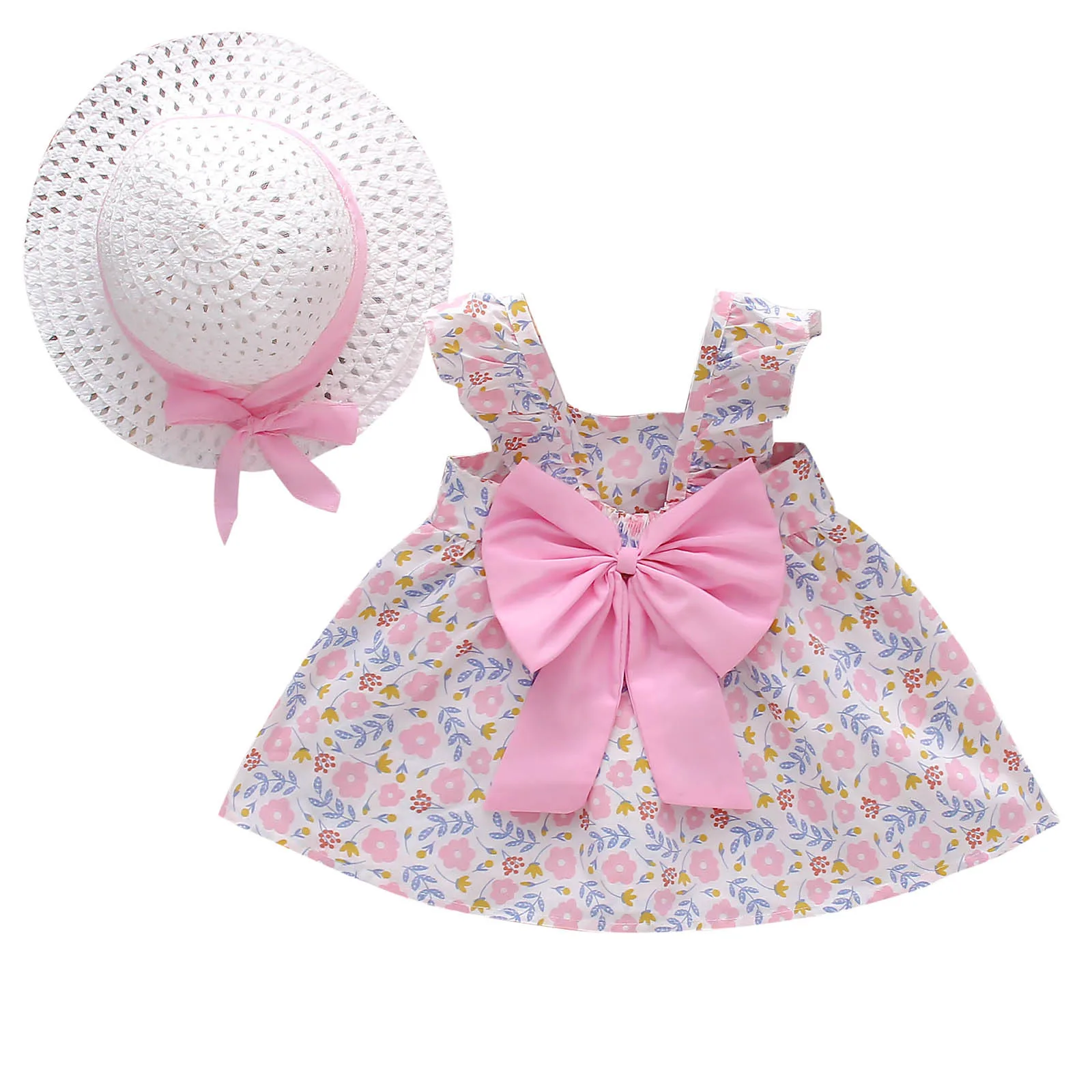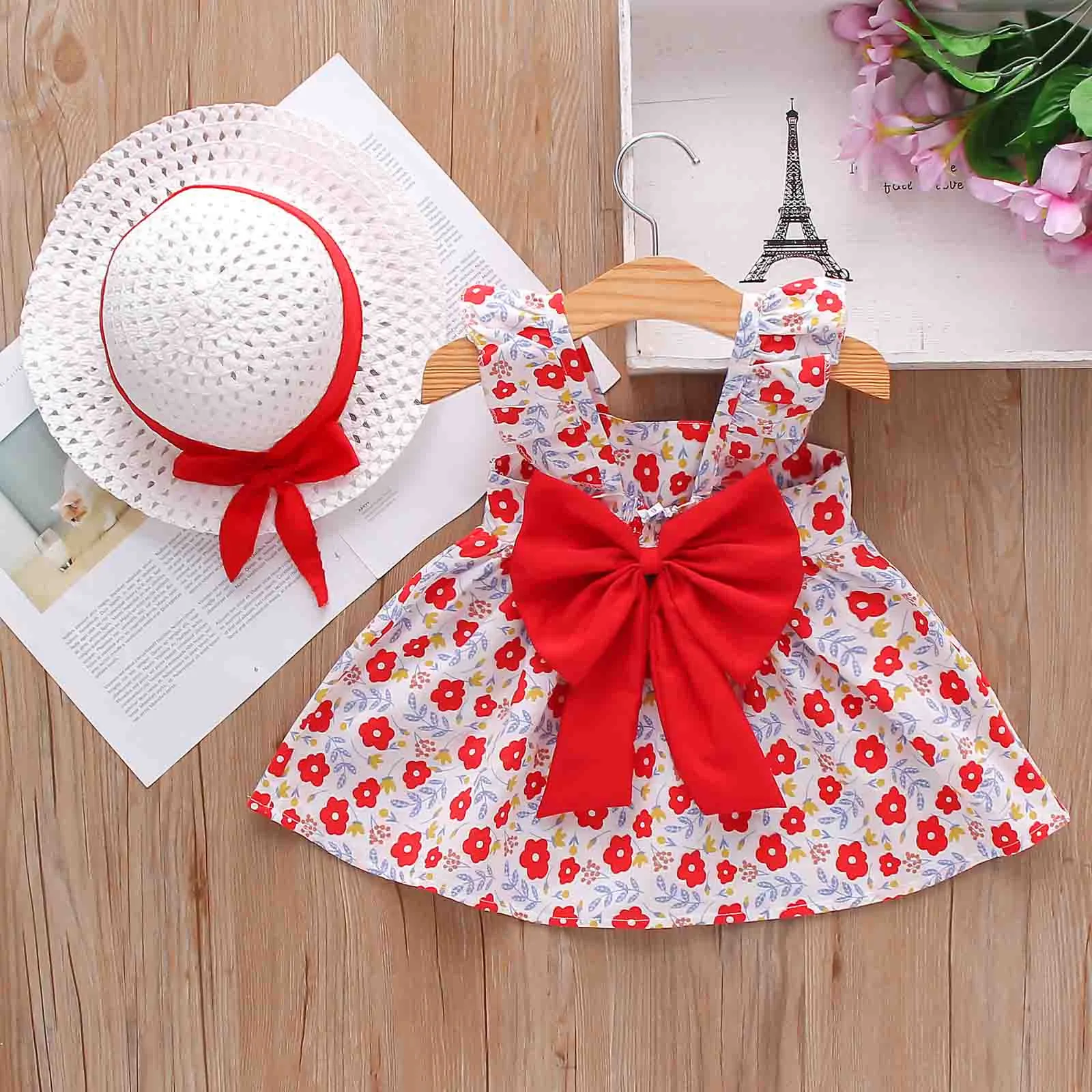 Модные Детские платья для девочек; Летнее платье с шляпой от солнца; Одежда без рукавов с цветочным бантом; Одежда для малышей; От 1 до 5 лет