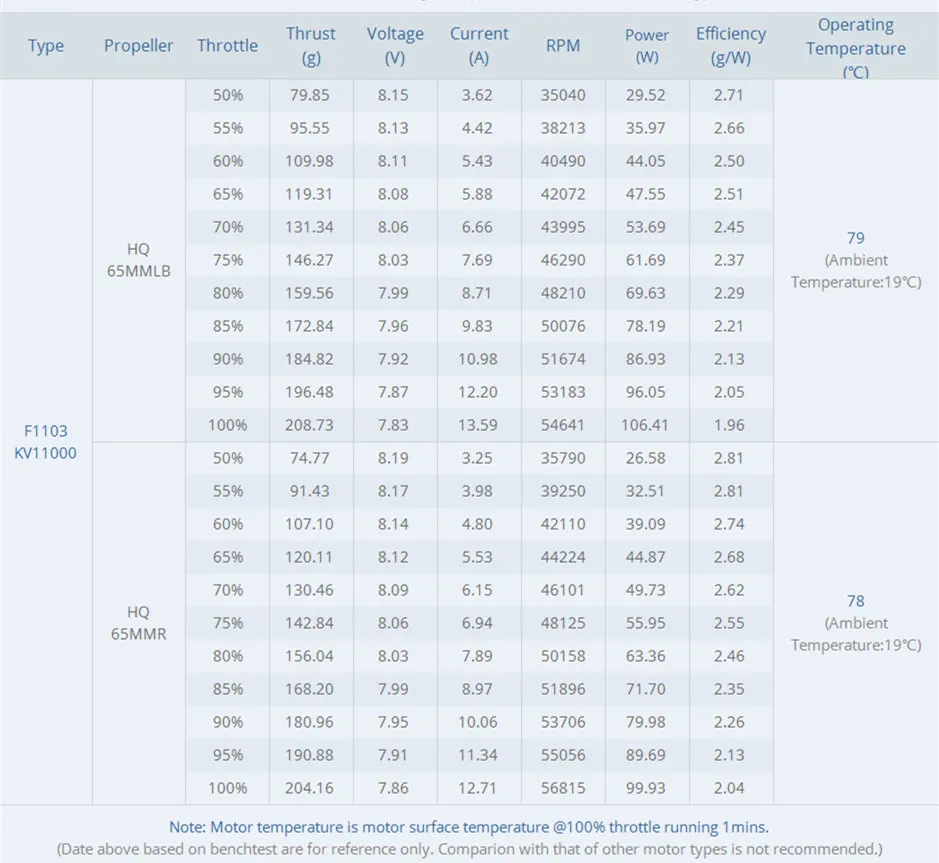 Ток холостого хода @ 10V: 0.58A @ 8000KV ; 0.65A @ 11000KV