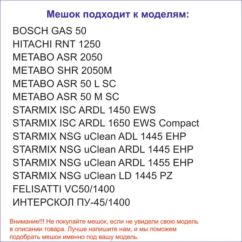 Мешок подходит к следующим моделям:BOSCH GAS 50HITACHI RNT 1250METABO ASR 2050METABO SHR 2050MMETABO ASR 50 L SCMETABO ASR 50 M SCSTARMIX ISC ARDL 1450 EWSSTARMIX ISC ARDL 1650 EWS CompactSTARMIX NSG uClean ADL 1445 EHPSTARMIX NSG uClean ARDL 1445 EHPSTARMIX NSG uClean ARDL 1455 EHPSTARMIX NSG uClean LD 1445 PZFELISATTI VC50/1400ИНТЕРСКОЛ ПУ-45/1400