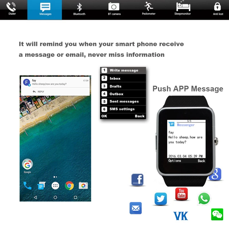 Спецификация: 1. Частота: GSM 850/900/1800/1900 МГц 2. Дисплей: TFT LCD, 240x240 пикселей 3. ЦП: MTK6261 533 МГц 4. Сеть и подключение: 5. Sim-карта: одна sim-карта (микро sim-карта) может быть как телефон 6.Bluetooth: Bluetooth 3,0 7. Память: RAM 32M, ROM 32M; Внешняя память: Поддержка tf-карты до 8GB 8. Камера: 0,3 м 9. Язык: английский, русский, испанский, польский, португальский, турецкий, итальянский, французский. Медиа: 1. Музыка: поддержка 2. Формат изображения: JPEG, GIF, BMP, PNG 3. Формат музыки: MP3, WAV 4. Функции: bluetooth-дозвон, контакты, напоминание о звонках, часы, защита от потери, шагомер, сон 5. Монитор, напоминание о сидячем положении, календарь 6. Аккумулятор: от 300 до 380 мАч 7. Вес изделия: 75 г Посылка включает в себя: Умные часы-1 шт. 1 х USB кабель 1 x Руководство пользователя
