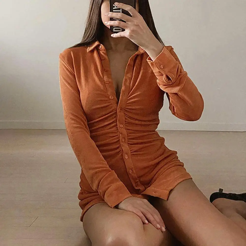 Примечания:Пожалуйста, обратитесь к нашей таблице размеров и выберите правильный размер.Из-за разницы в освещении и настройках экрана цвет товара может сильно отличаться от изображений.Посылка входит:1 x платье (сумка не входит в комплект)Плиссированное Платье-блузка с отложным воротником, на пуговицах, пикантное мини-платье с длинным рукавом, однотонная уличная одежда, женская рубашка