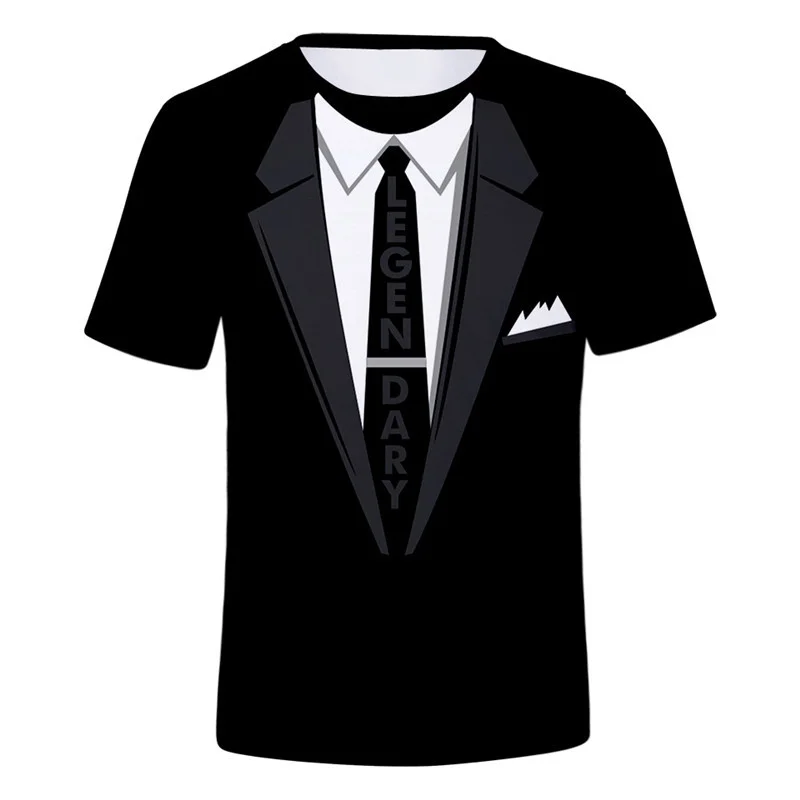 Новинка лета 2021, уличная одежда с коротким рукавом, имитация жилета, 3D футболка, модный смешной имитационный костюм, галстук-бабочка для смокинга, мужские футболки с 3D принтом