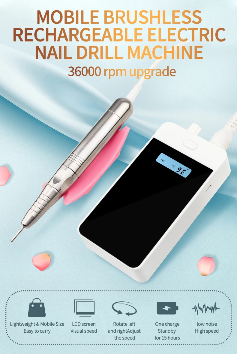 Перезаряжаемая профессиональная бесщеточная дрель для ногтей 35000 об/мин, электрическая дрель для маникюра, 36 Вт, инструмент для педикюра с бесщеточным двигателем и зарядкой ногтей