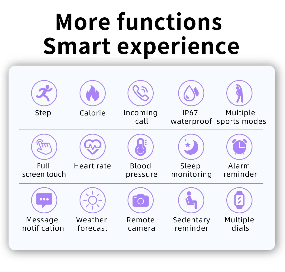 Мониторинг сердечного ритма/артериального давления, отображение времени/даты, шагов, расстояния, калорий, мониторинг сна, напоминание о звонках, напоминание о сообщении в социальных приложениях, напоминание о малоподвижности, напоминание о наличии функции включения переключателей на стороне приложения (входящие звонки, SMS, Wechat, QQ, Facebook, Twitter, LinkedIn, WhatsApp, Line, Instagram, Snapchat, Skype и другие приложения на мобильный телефон) и напоминания о событиях, таких как сидячие часы, будильник, питьевая вода, лекарства и т. д., удаленно фотографируйте, поднимите запястье, чтобы осветить экран, включите формат, секундомер, Найдите телефон