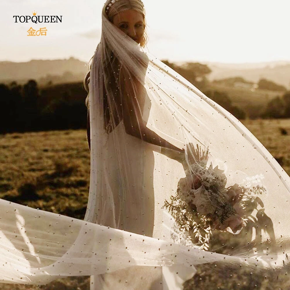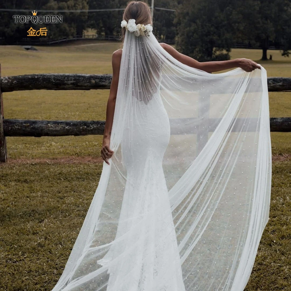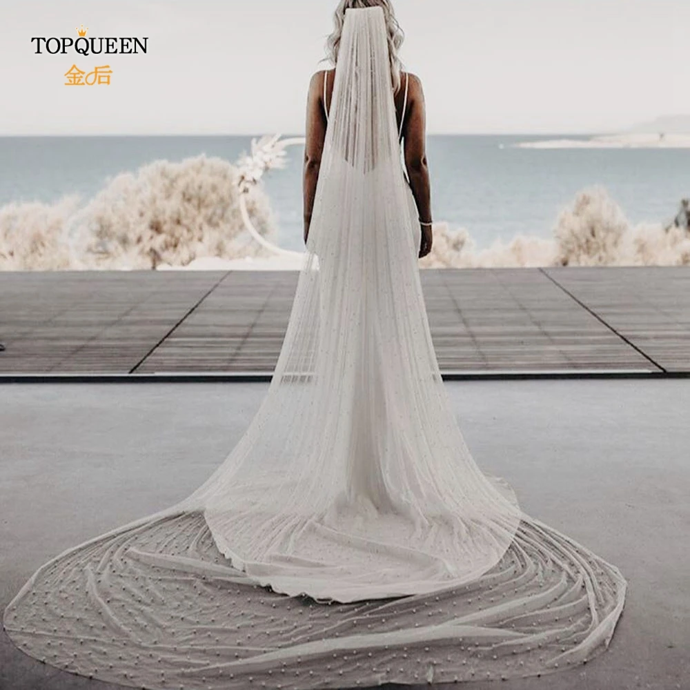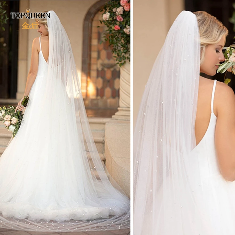Фата свадебная TOPQUEEN V09, длинная, с жемчугом, тюлевые Свадебные...