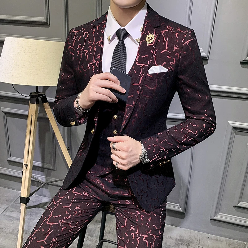 Мужской свадебный костюм, темно-синий костюм с жилетом и брюками, с цветочным принтом