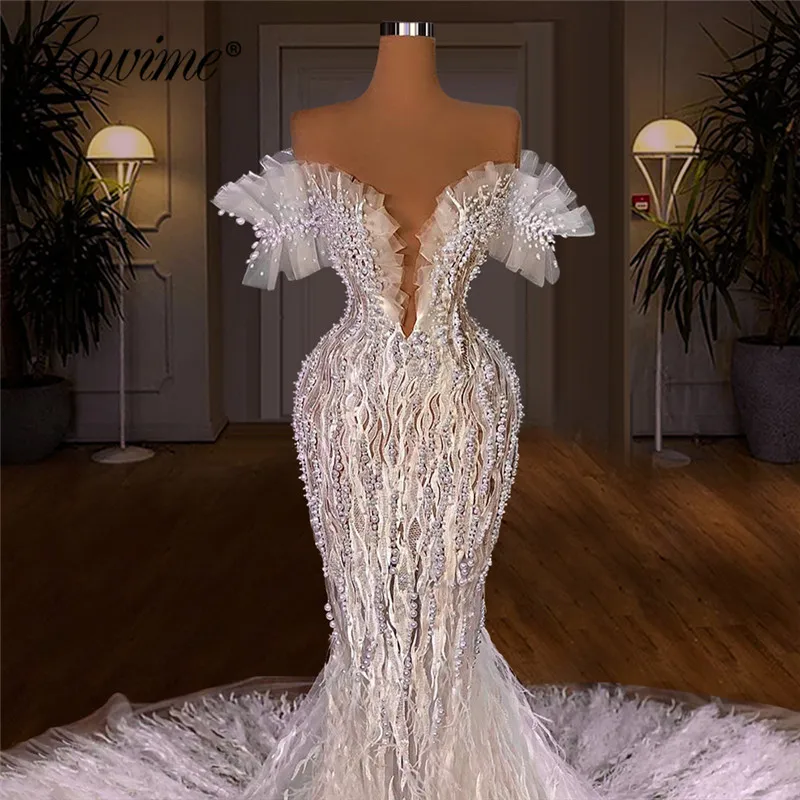 Lowime Роскошные Длинные вечерние платья из Дубая с перьями с открытыми плечами вечерние платья ручной работы с жемчугом халаты арабское платье-Русалка для выпускного вечера